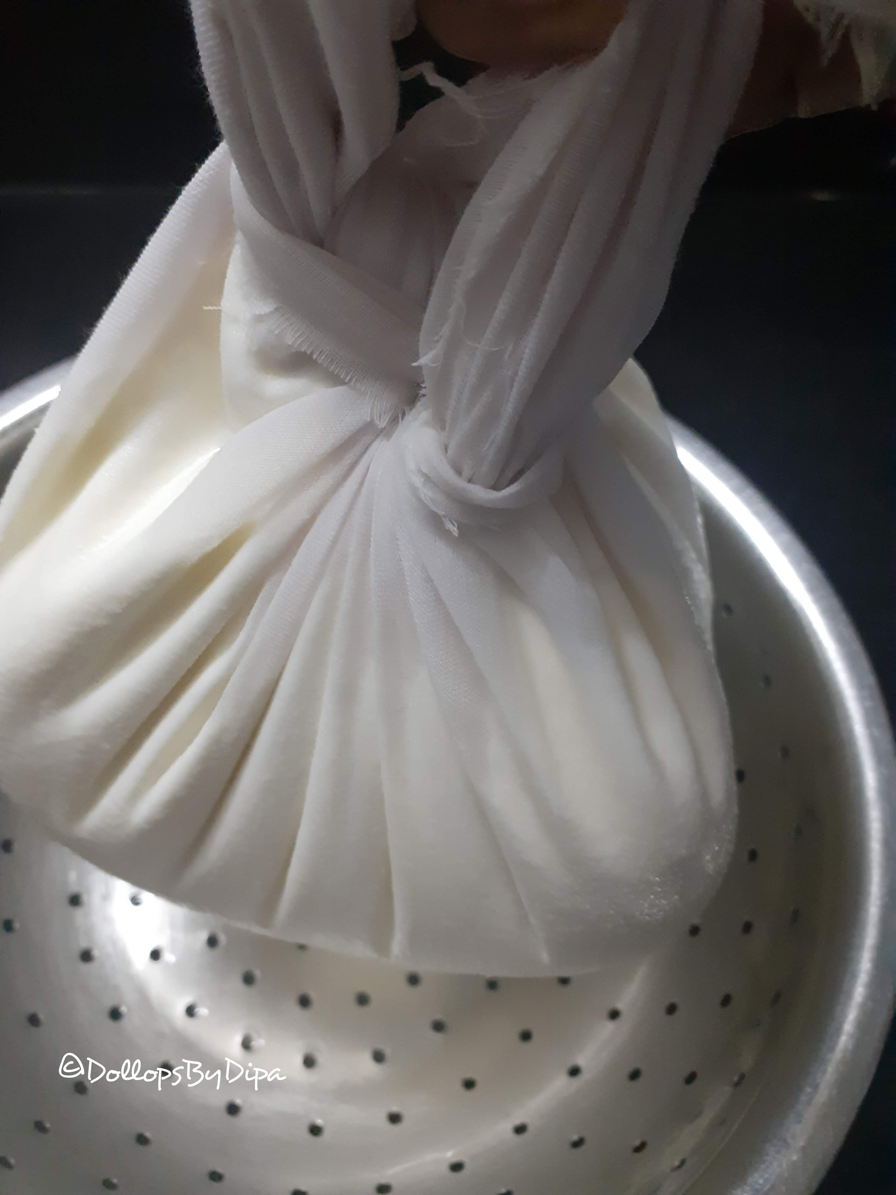 - Tie curd in a muslin cloth and hung it. So we can get thick curd. Keep it in refrigerator so it doesn’t turn sour.
