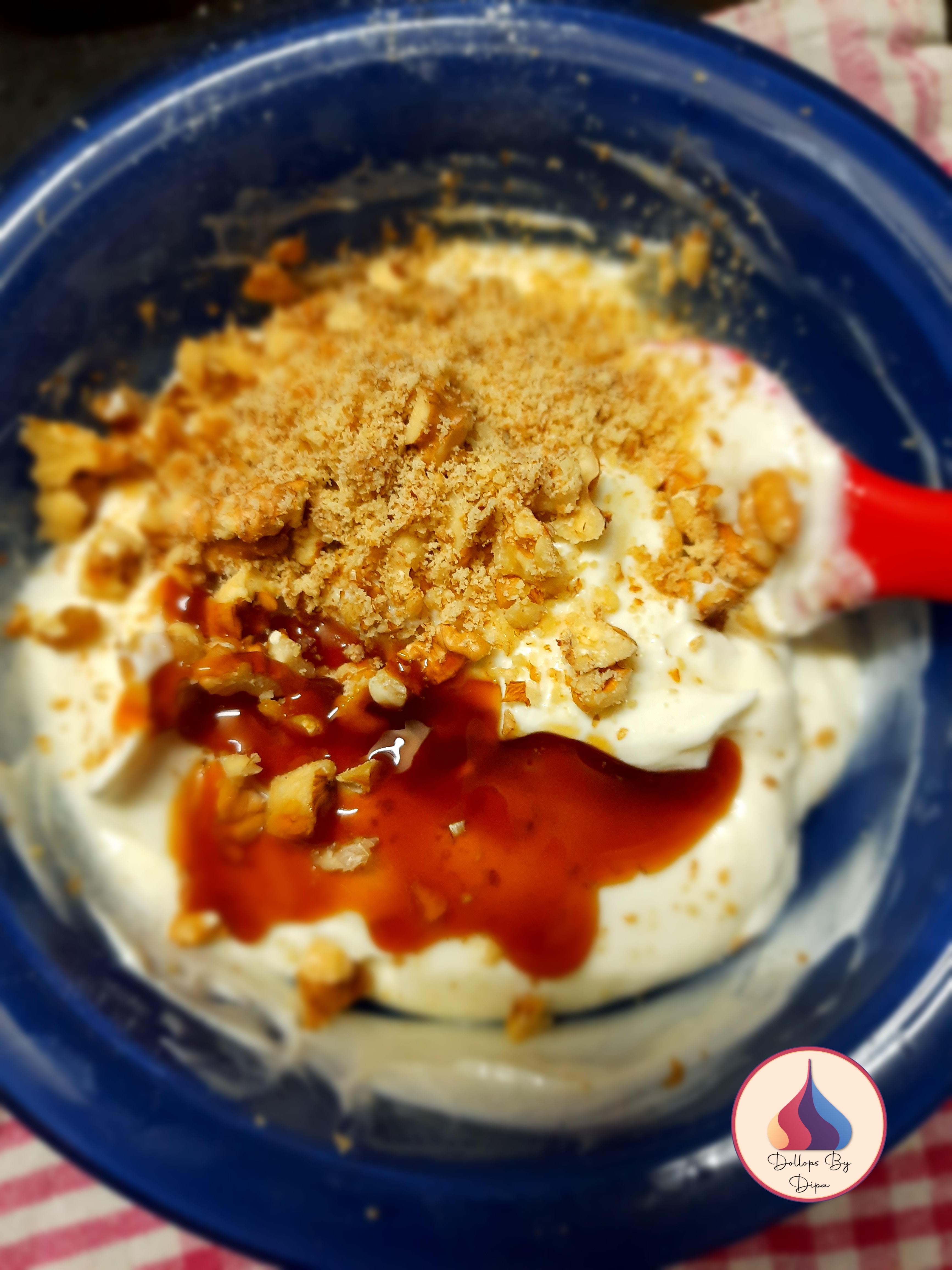 3. Now add caramel sauce and walnuts and mix with a light hand.