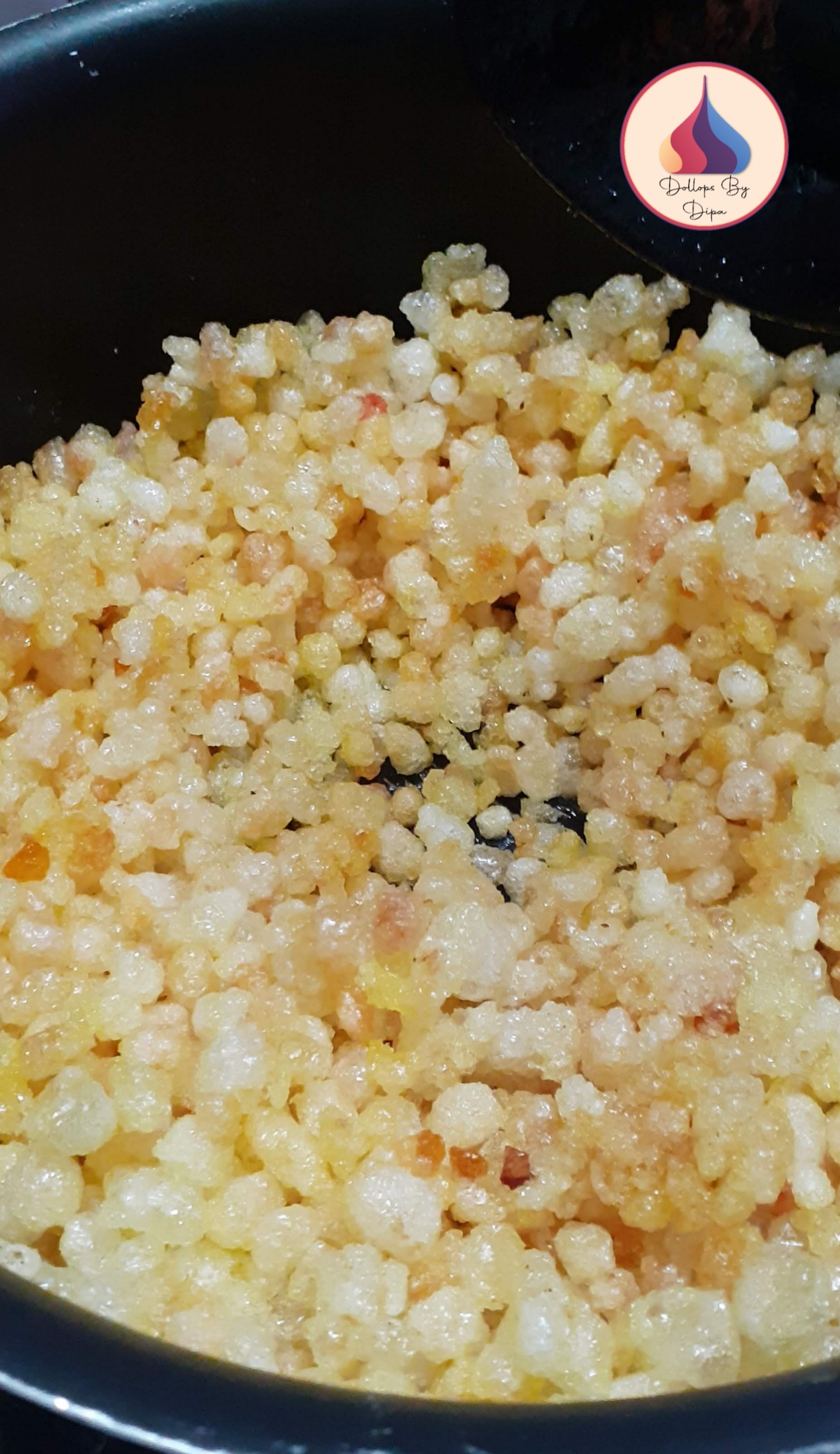 - In non stick pan heat ghee & fry goond. It will pop up. Try not to take more ghee. If after frying more ghee is left then remove excess ghee.