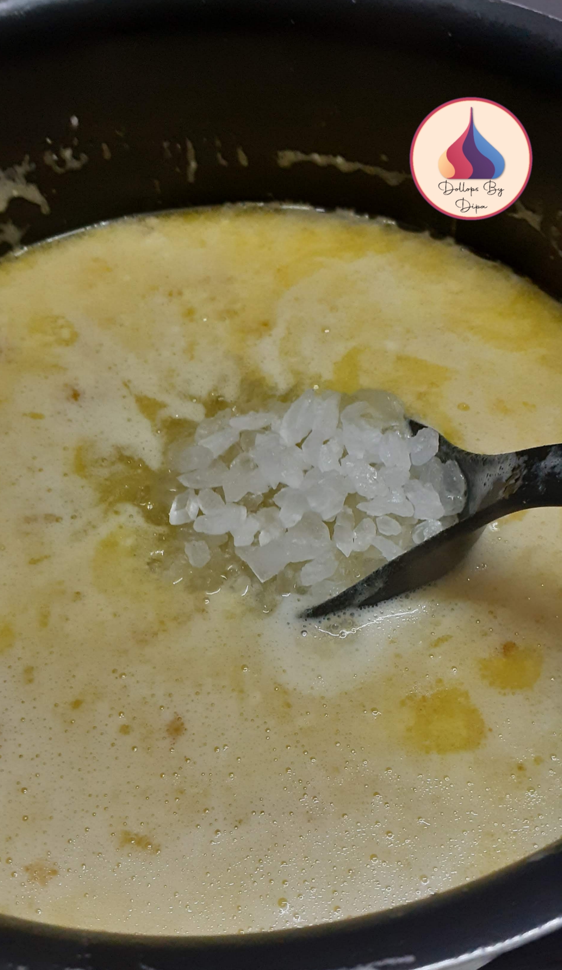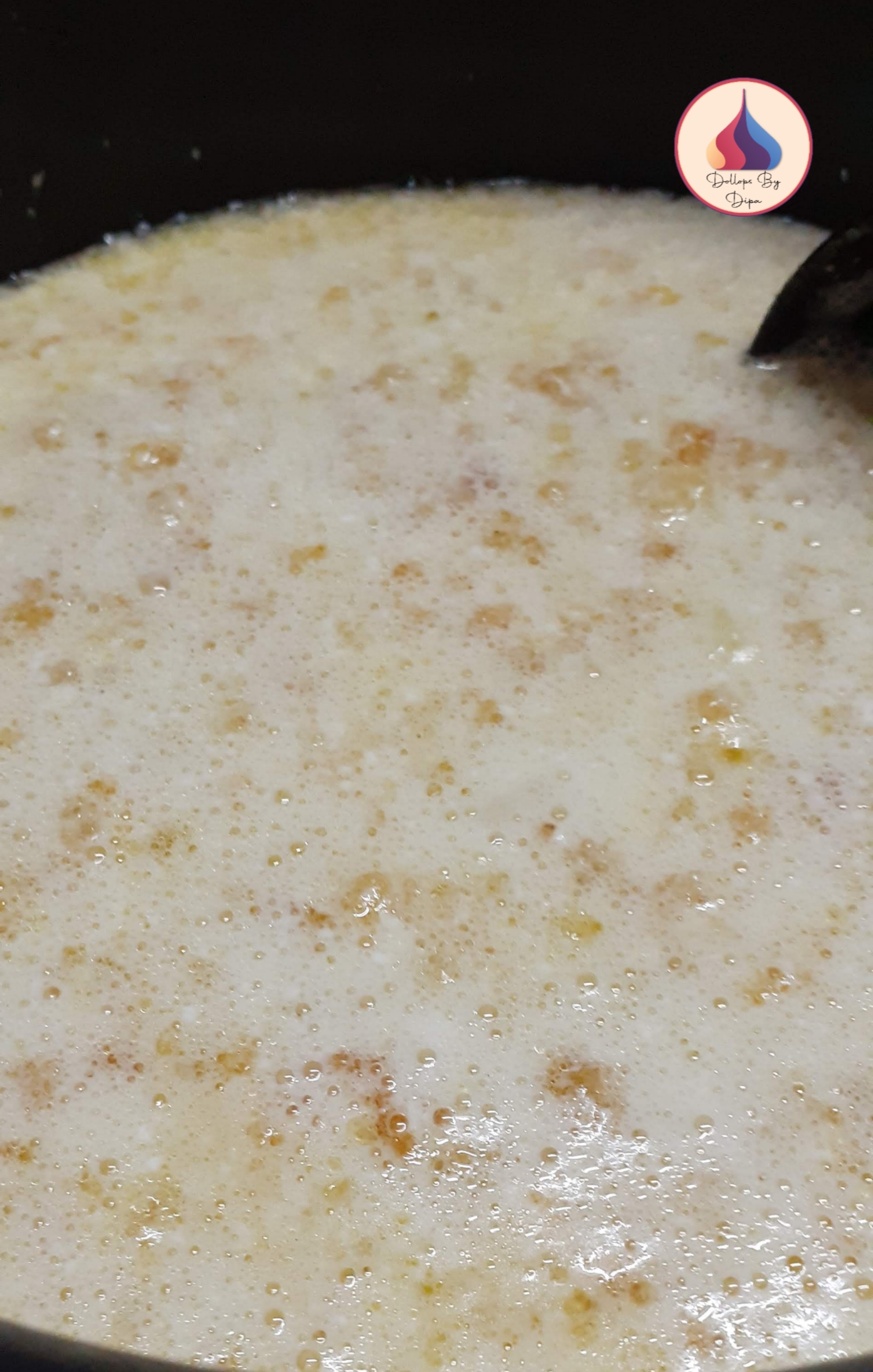 3. Now add hot milk in fried goond . As milk and goond mixes and starts boiling, milk starts curdling, stir continuously.