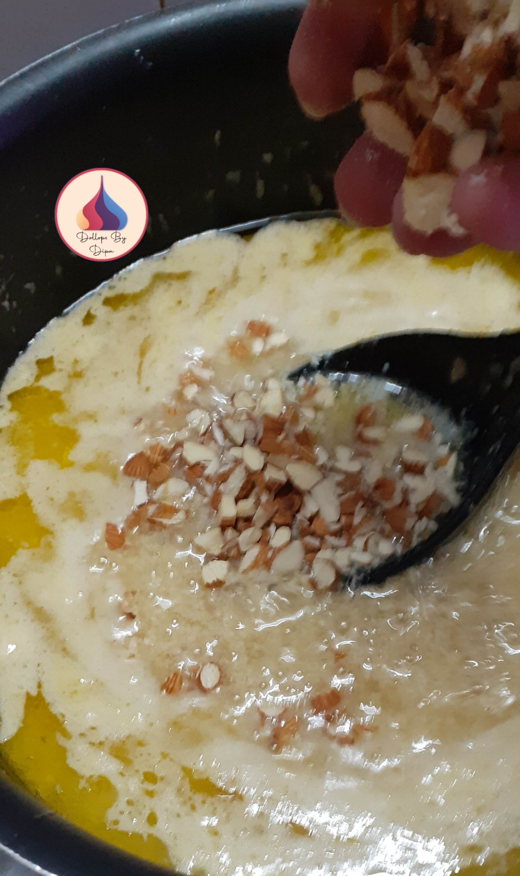 4. After a few minutes, add khadi sakar, sliced almonds, slightly crushed poppy seeds at this stage. Keep stirring.