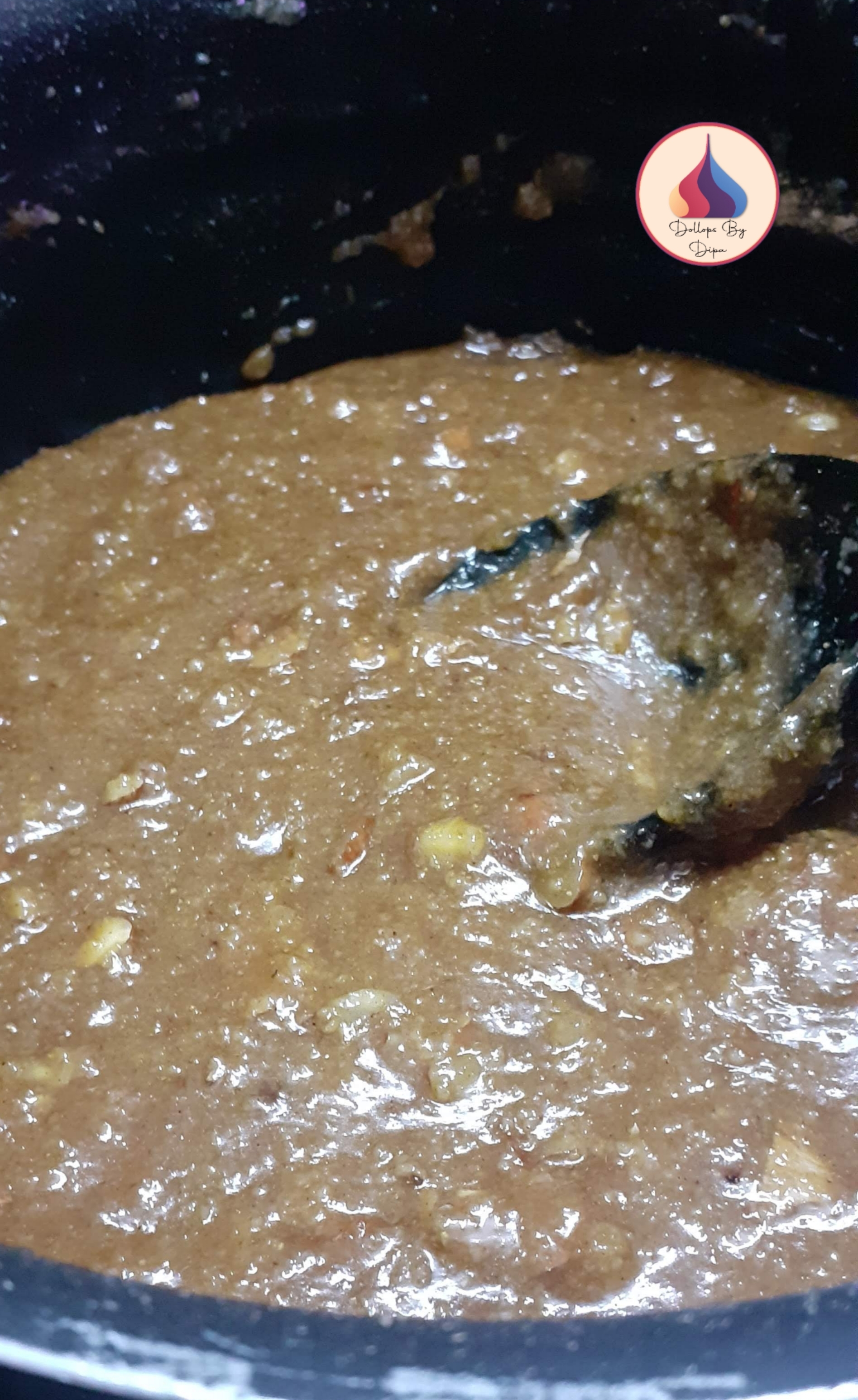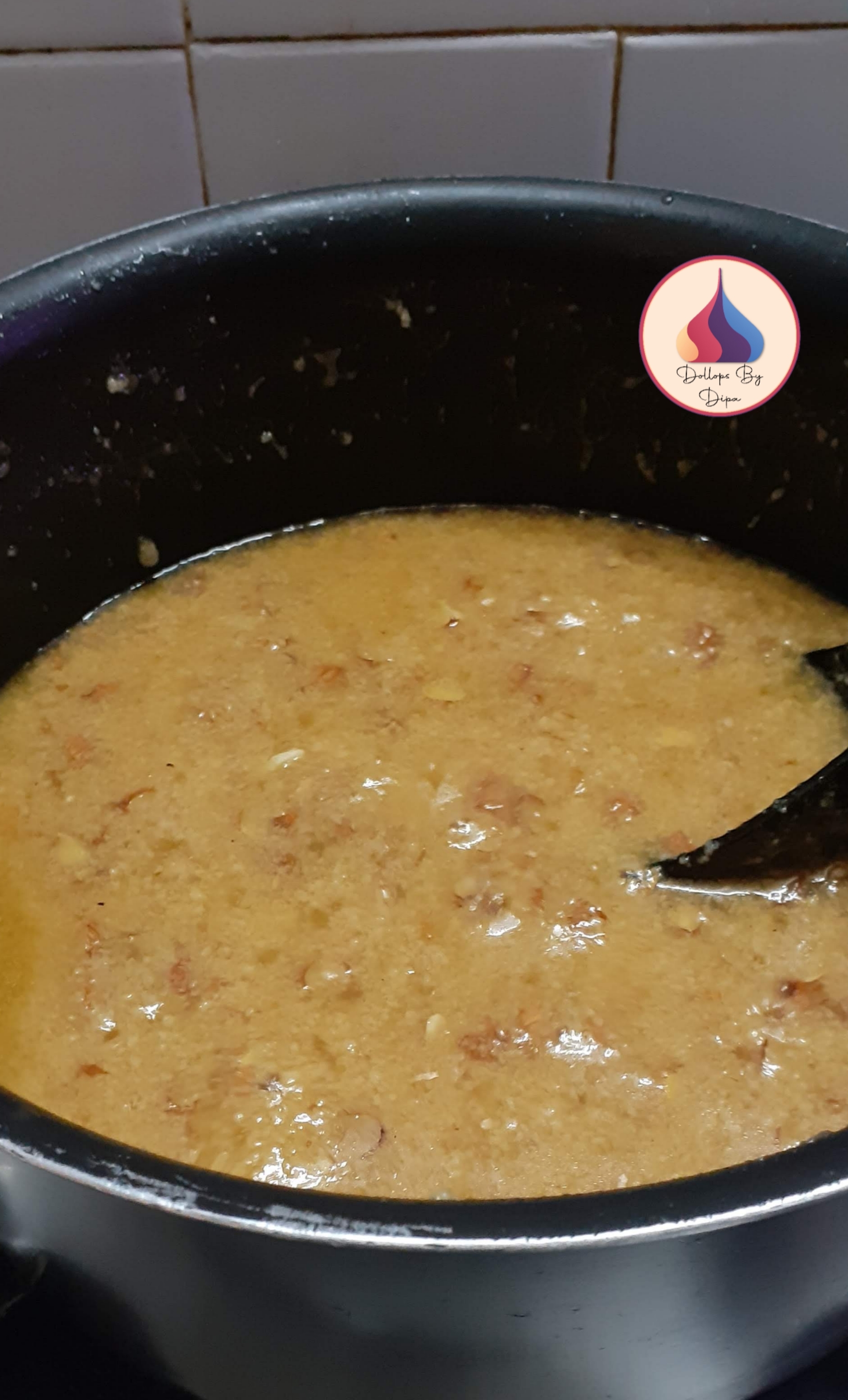 5.Now let it cook on slow medium flame till it becomes thick, when it cooks completely it will start leaving edges of pan.