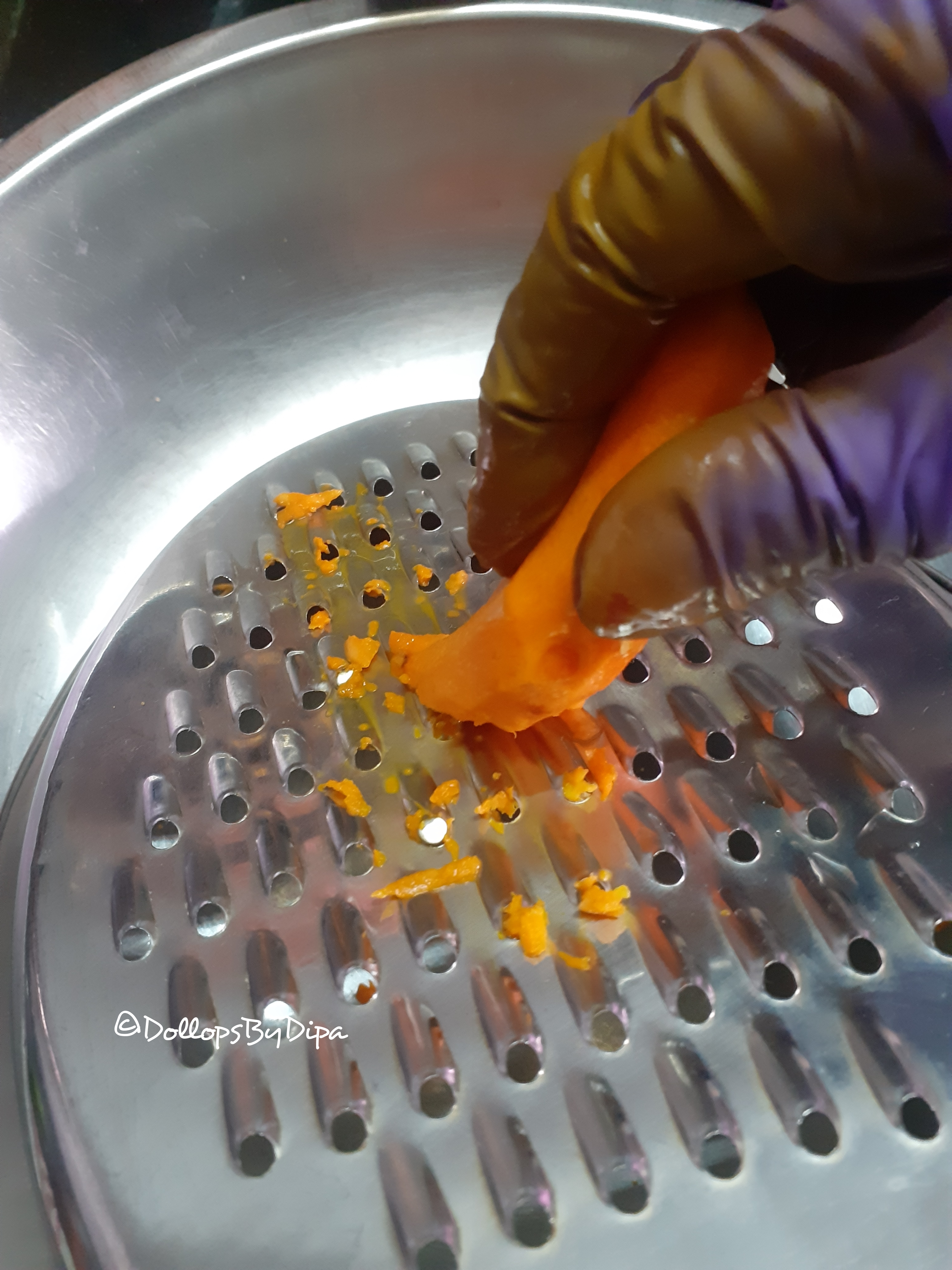 - Wash and peel turmeric roots, then grate them.