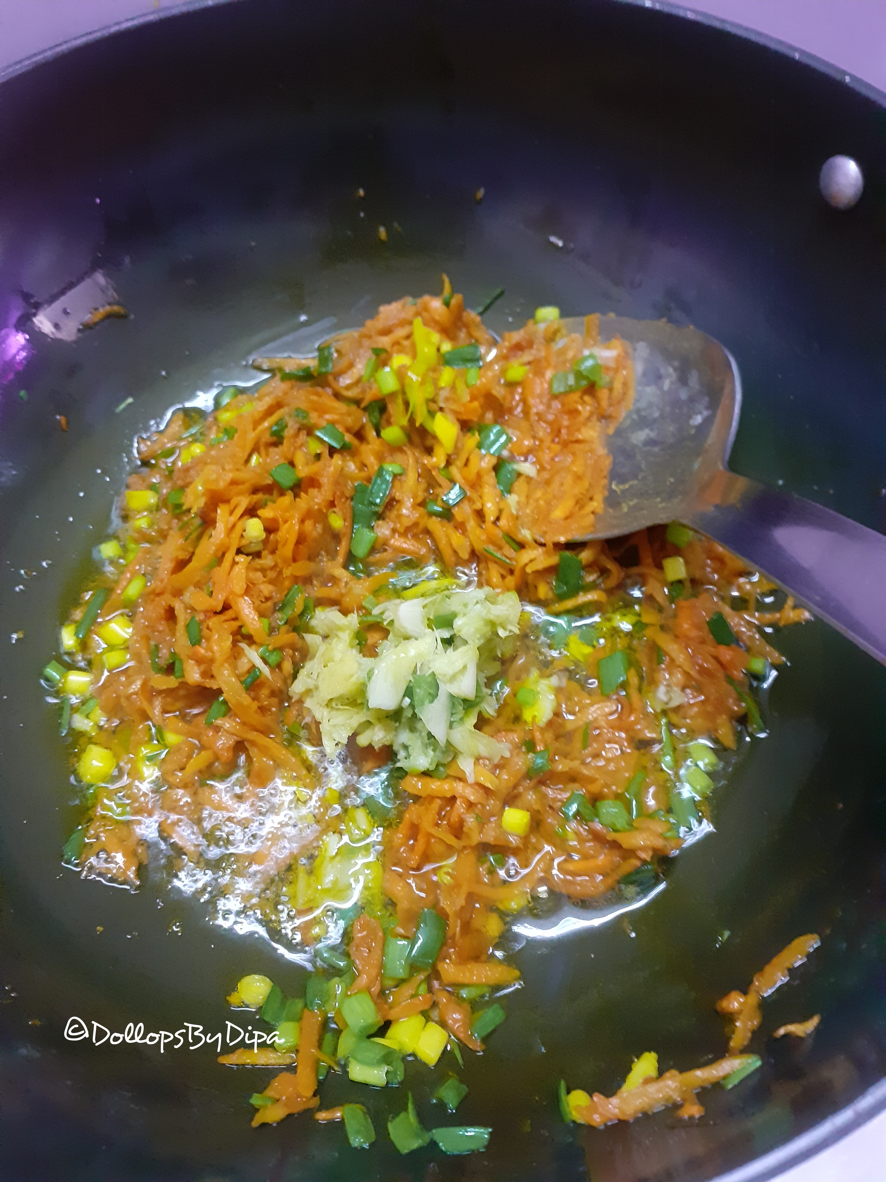 3. Add green garlic and sauté for 1-2 minutes. Then add ginger chilli paste and sauté for couple of seconds.