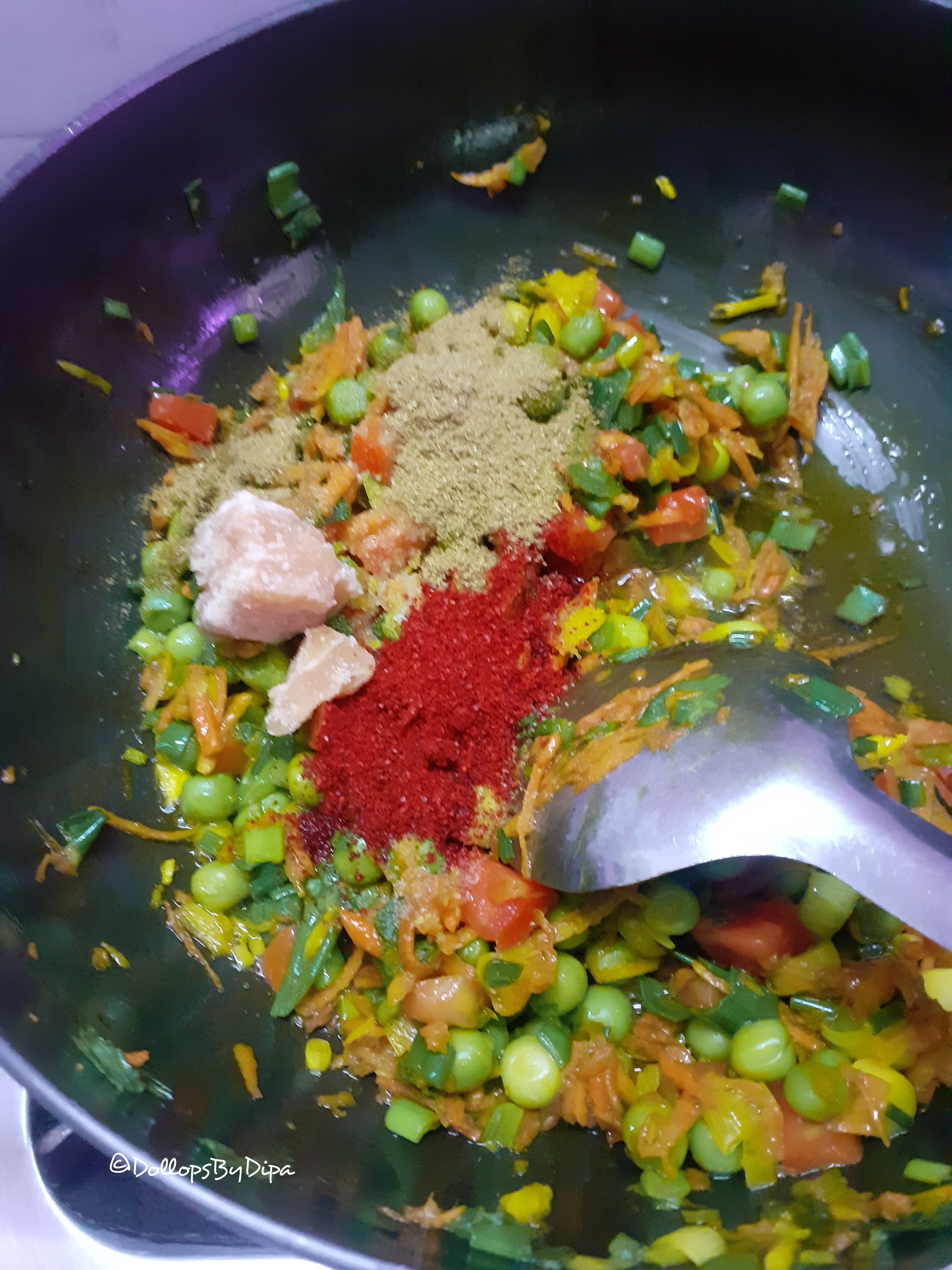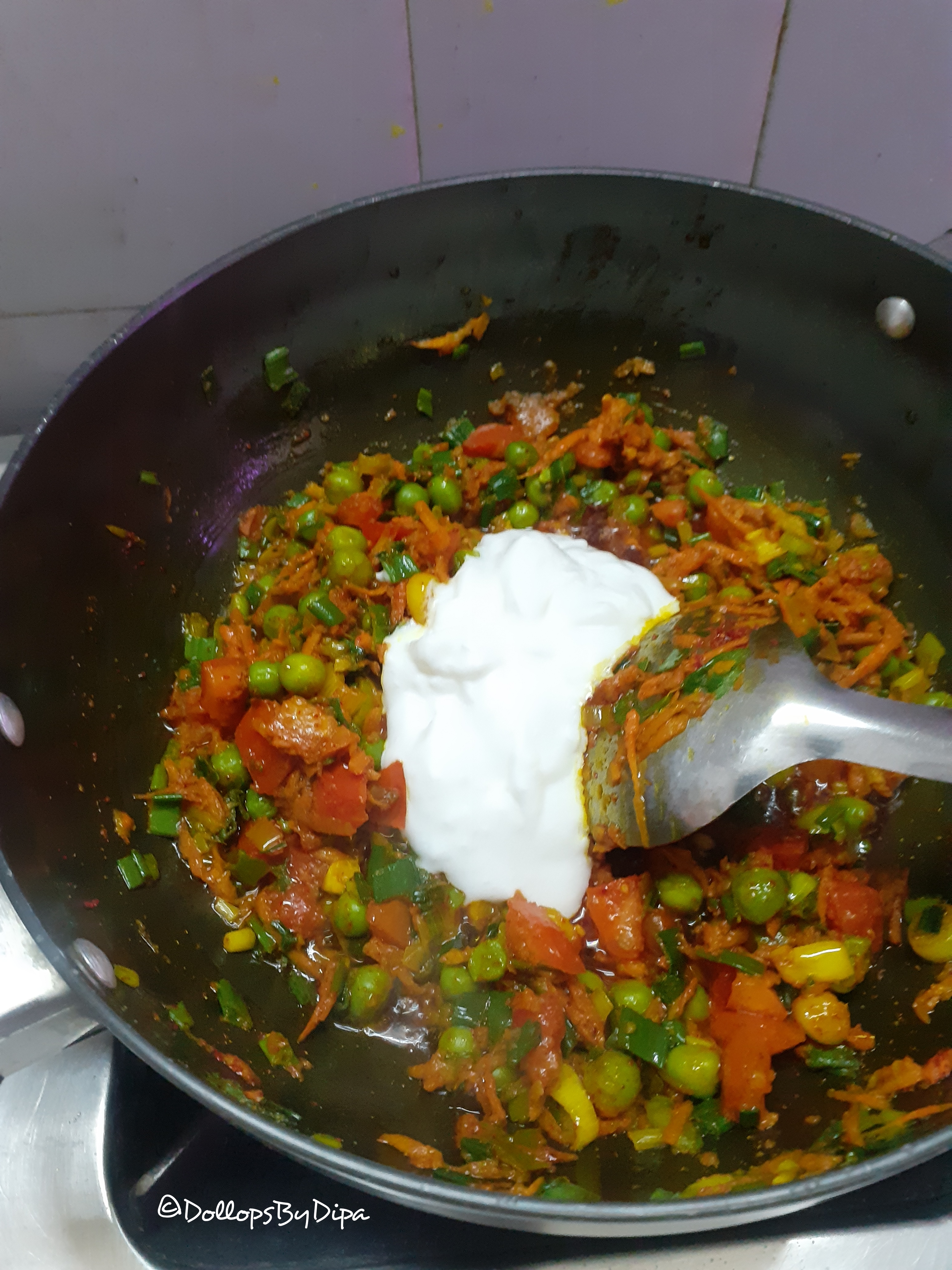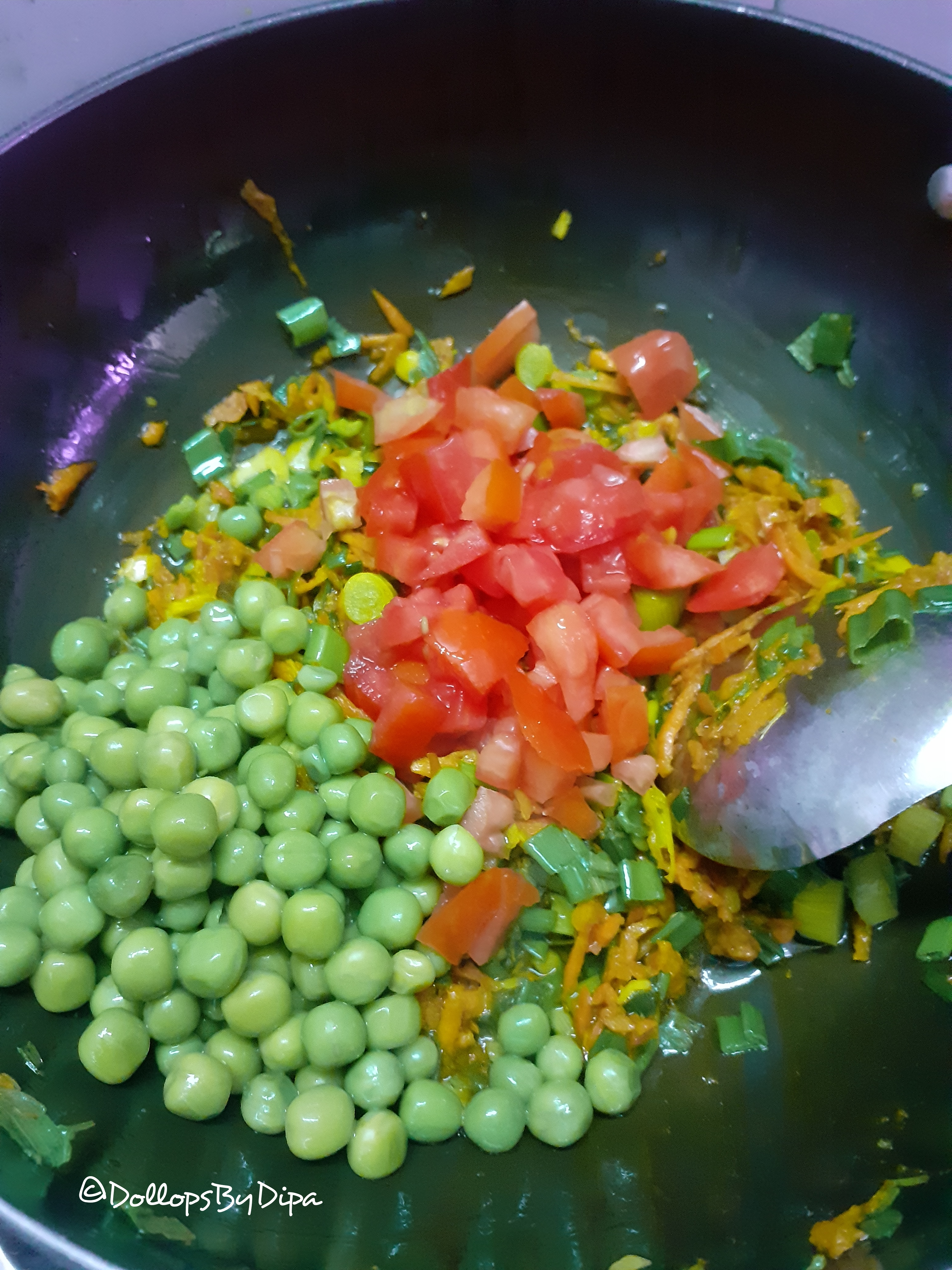 4. Add spring onions and sauté for 2-3 minutes. Further add tomatoes and green peas and sauté for 2-3 minutes.
