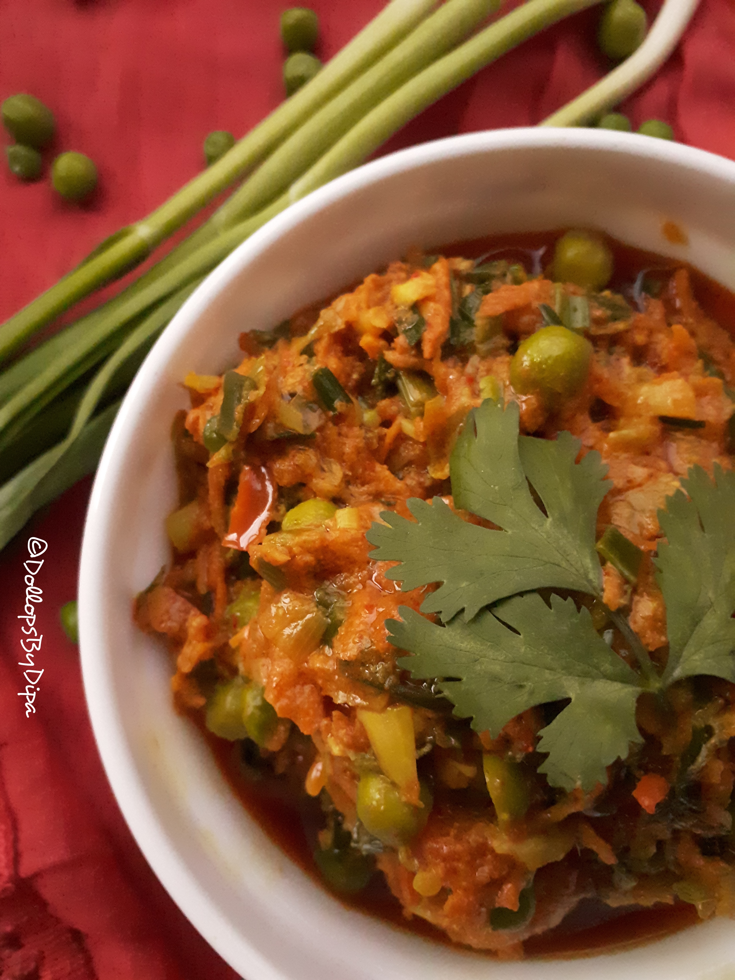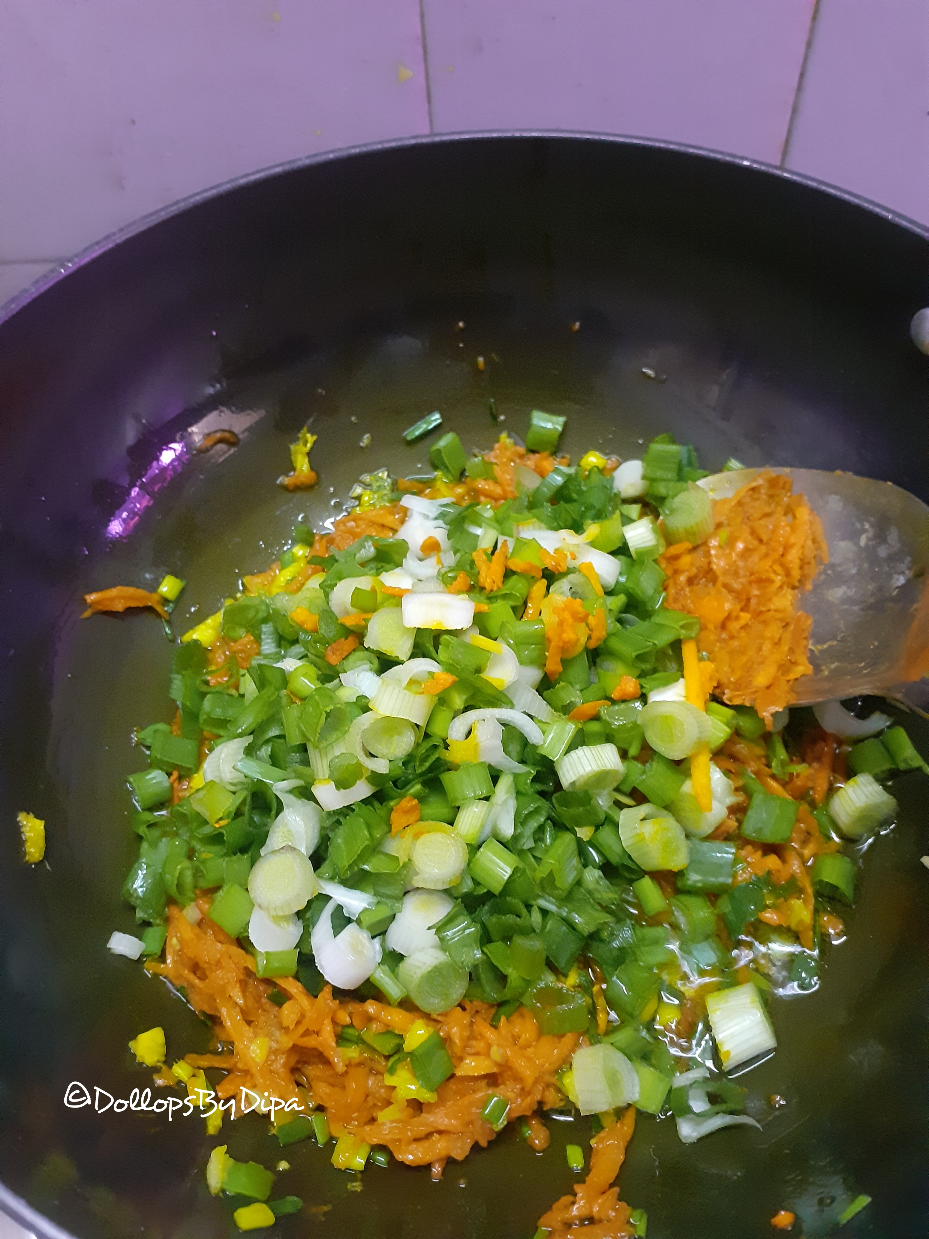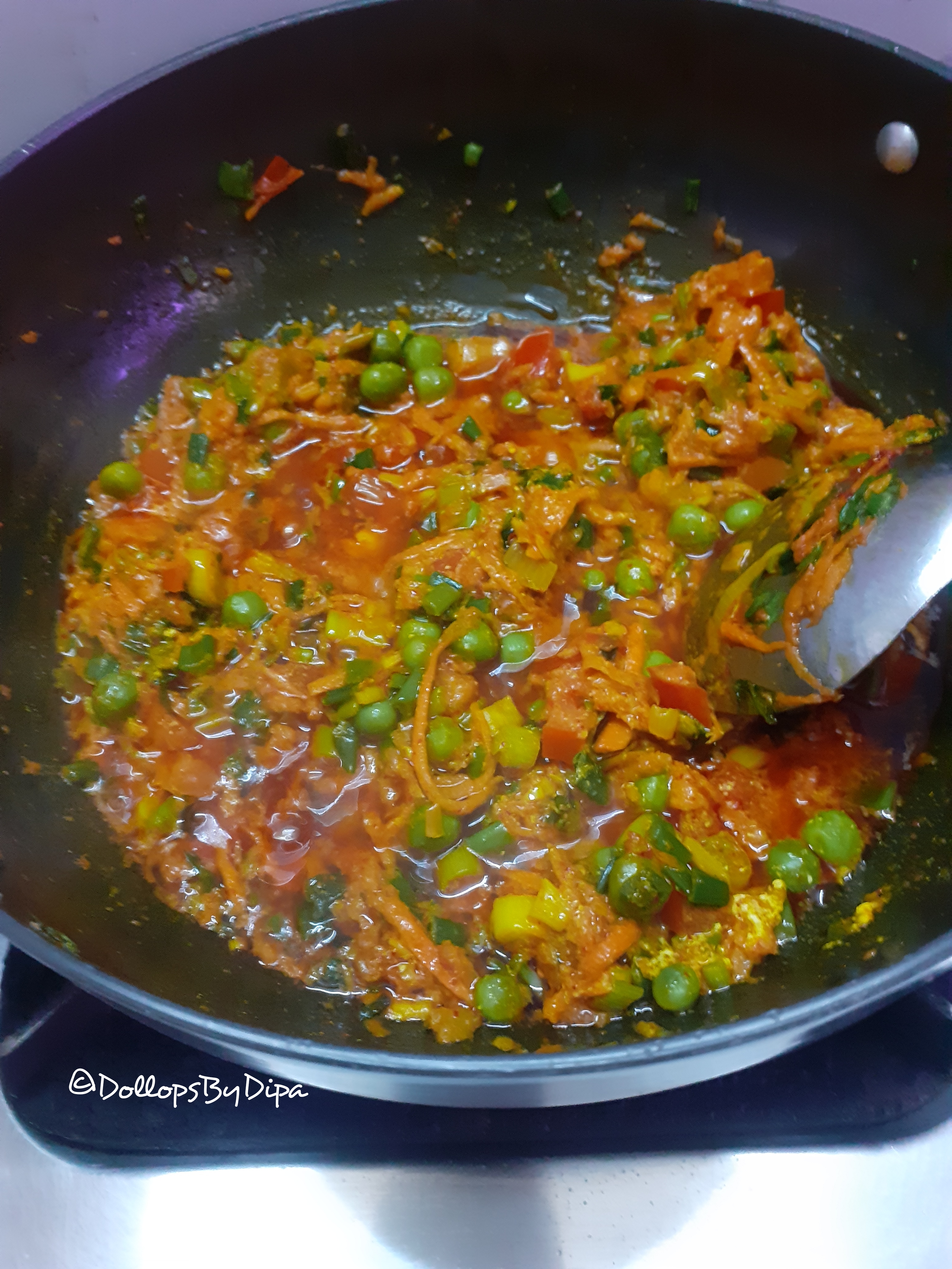 4. Add spring onions and sauté for 2-3 minutes. Further add tomatoes and green peas and sauté for 2-3 minutes.