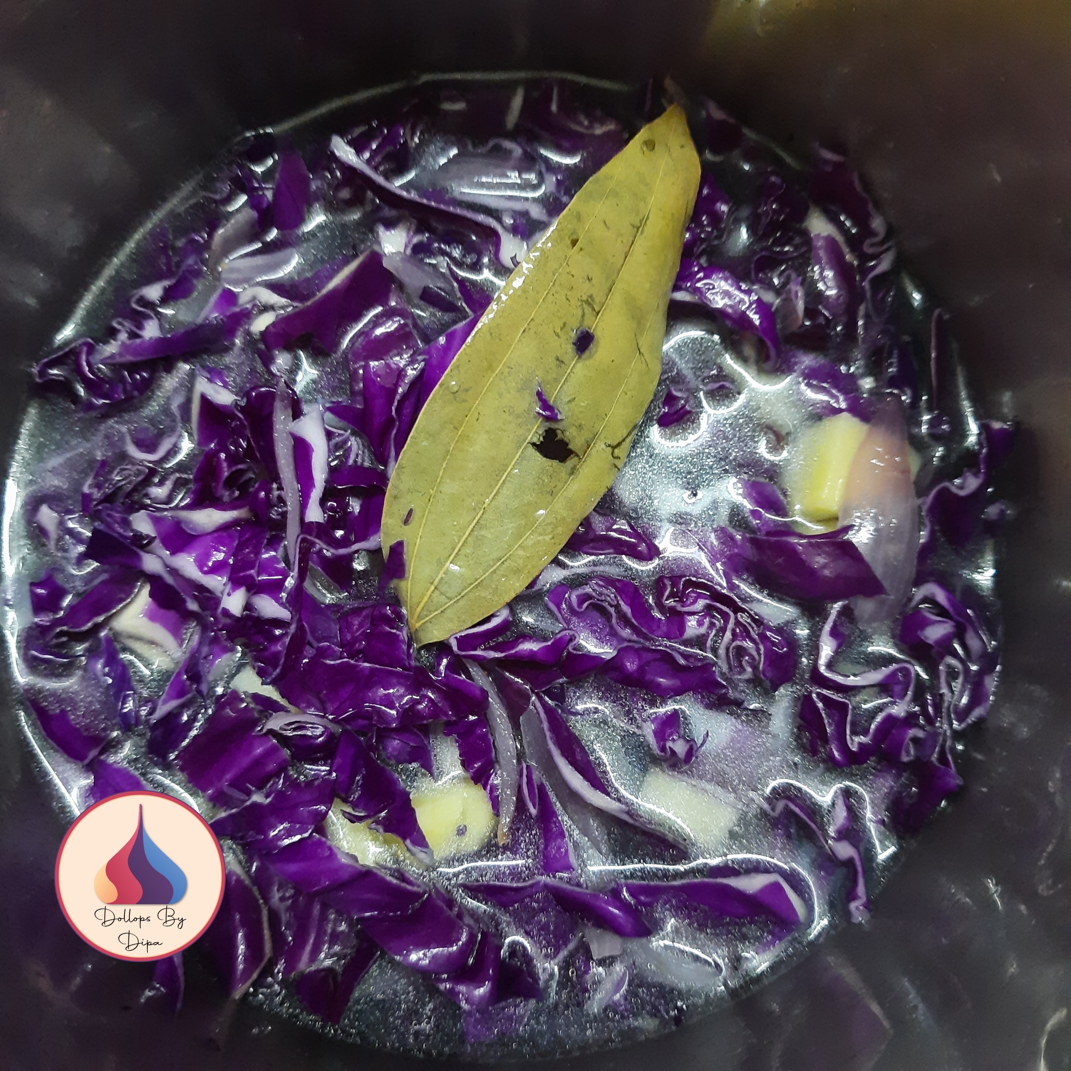 2.Further add cabbage and potato and sauté for a while. Add 1/4 cup of vegetable stock or plain water. Mix and close the lid of pressure cooker and cook for 3 whistles.