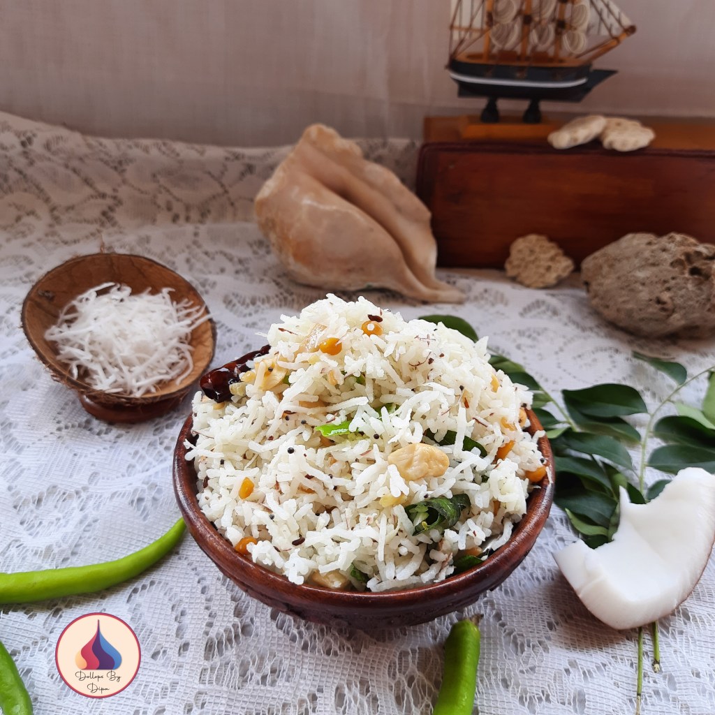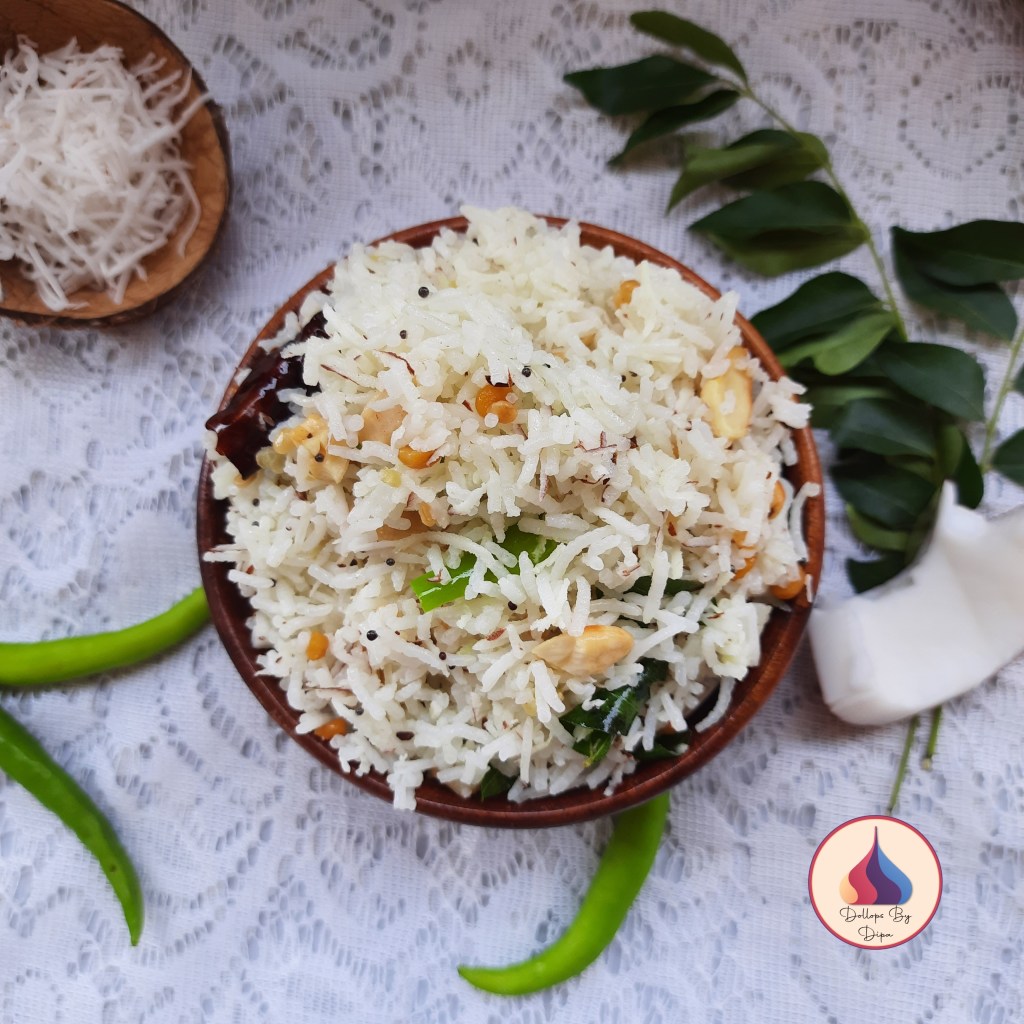 This easy and quick rice delicacy is commonly prepared in South Indian households during festivals , any special occasion and common lunch box. This traditional rice dish is always prepared in Valaikappu/Seemantham/ baby shower function. It is also offered as prasadam in temples. Apart from rice and coconut, it’s tempering makes this dish more flavourful and aromatic. Coconut rice goes well with papad/apalam and curry.
