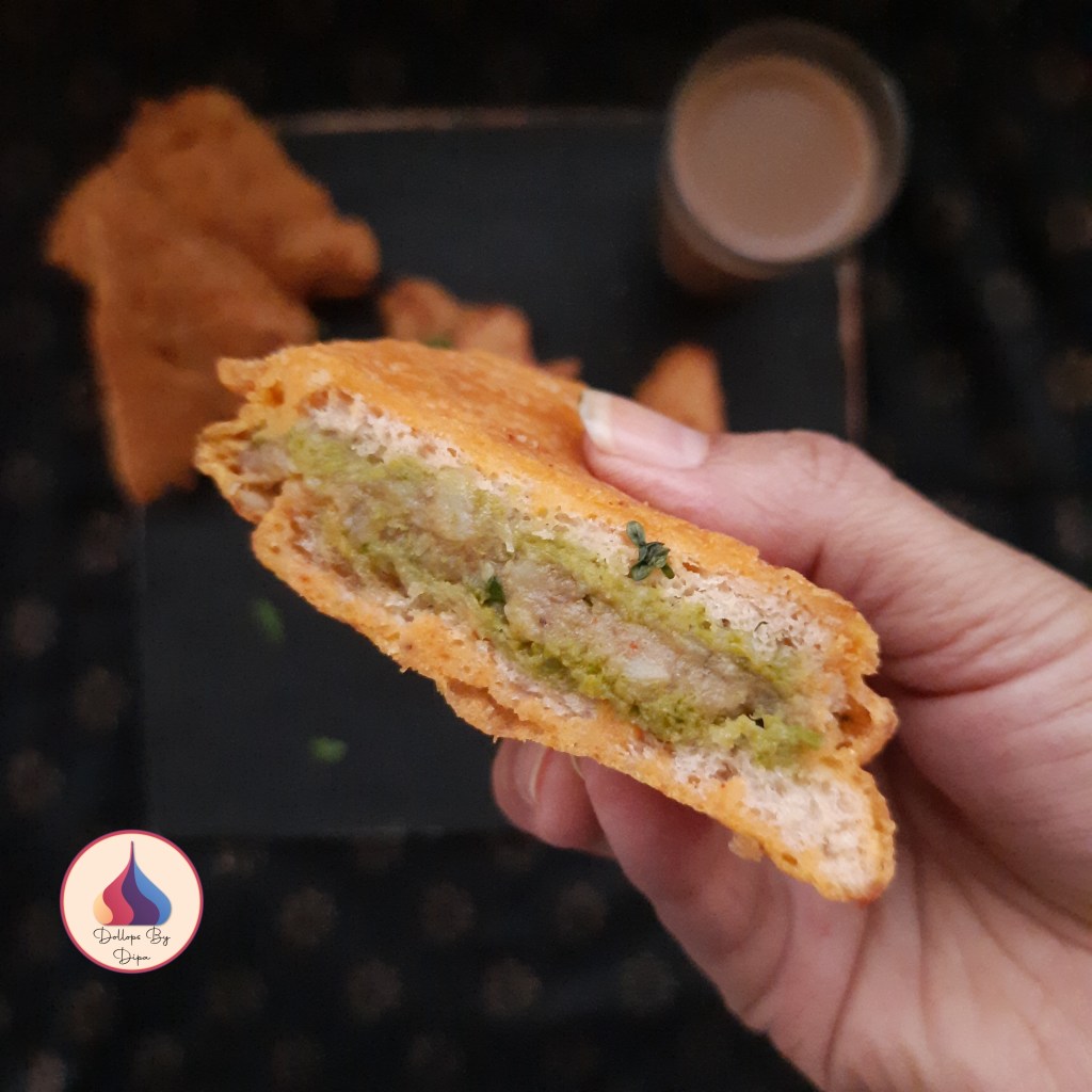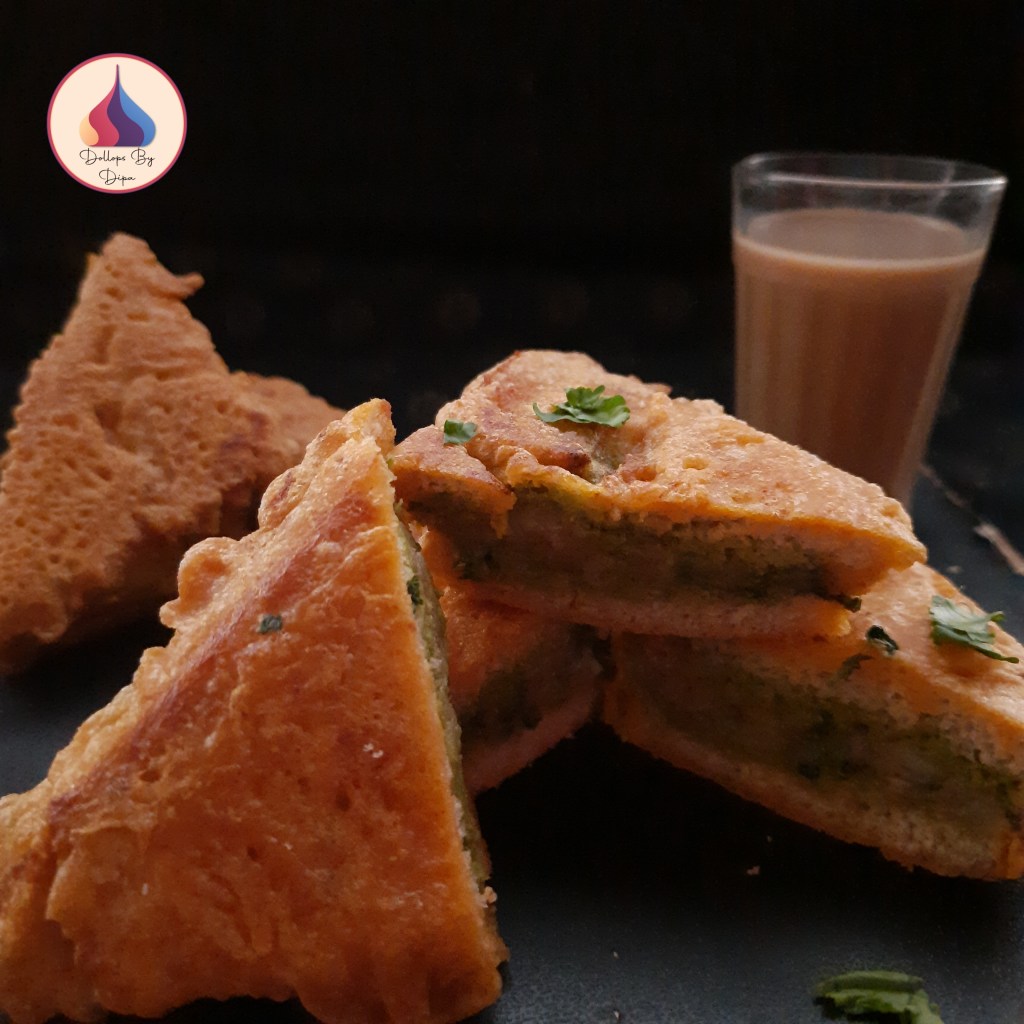 - Heat oik, dip the prepared sandwich triangle in prepared batter and carefully put in heated oil. Deep fry it from both sides and then remove with slotted spoon. Continue the same process with rest of bread and stuffing.