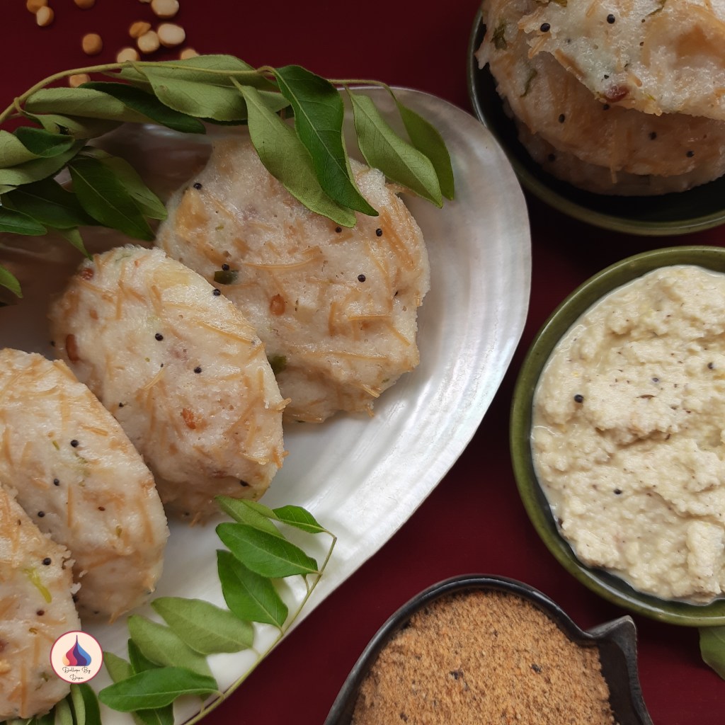 Rava/sooji and semiya/vermicelli are kitchen staples in South Indian households. That can be used for quick recipe like upma, idli etc. Vermicelli Idli is very popular in Karnataka. These idlis are quick and instant as they don’t need fermentation. The tempering adds the aroma and cashew nuts gives the crunchiness. You can add boiled vegetables to make it more wholesome.