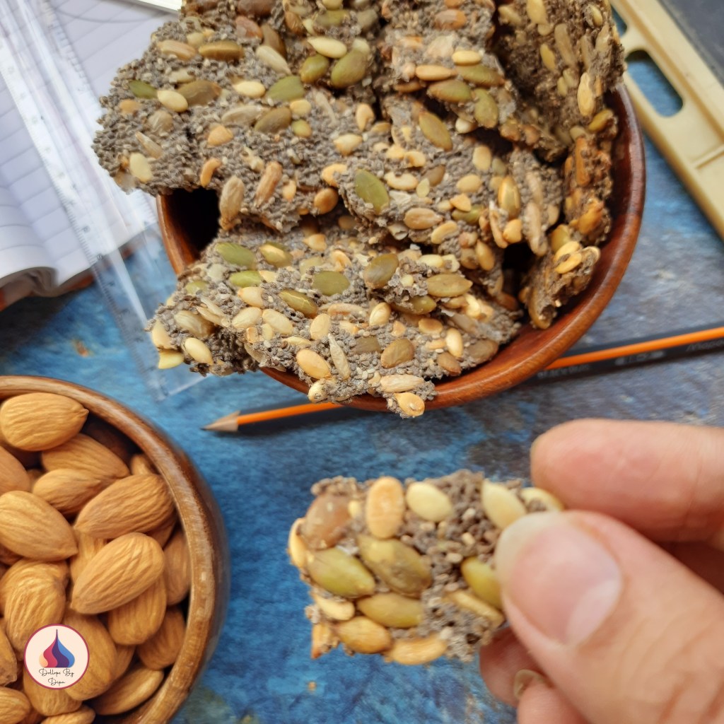 - Remove from oven and let it cool completely. Then roughly break and store in an air tight jar. Healthy crackers can be enjoyed with any dip or can enjoy alone.