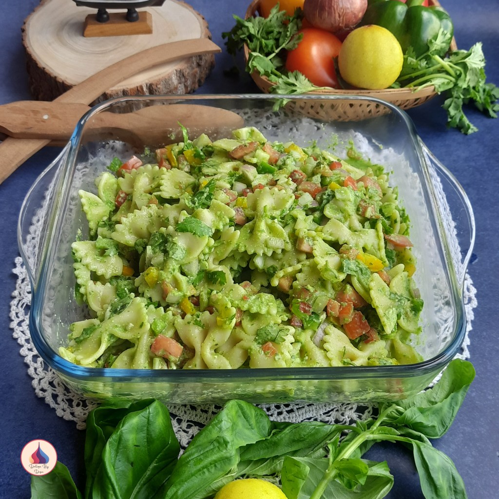 I prepared this salad using refreshing pesto dressing, farfalle pasta and vegetables. This delightful and refreshing salad can be prepared quickly and also be consumed as a mini meal.