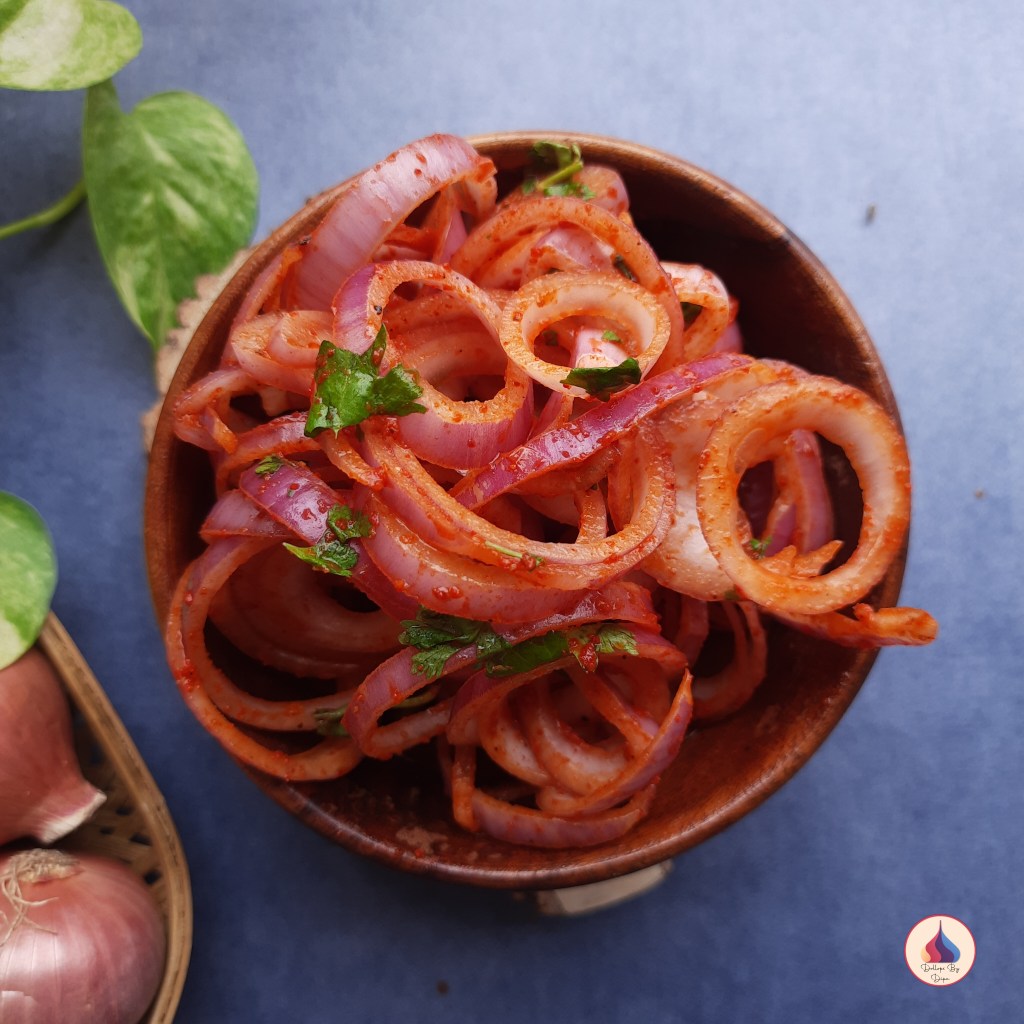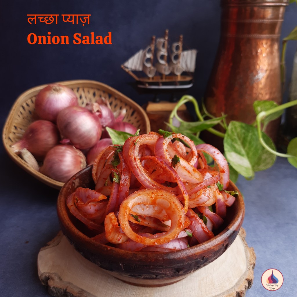 Laccha Pyaz is a spicy onion salad which is popular in India, especially in North India. This quick salad is prepared with onion (preferably red onion) and some basic spices and herbs. This salad is a staple as restaurants and highway dhabas. This salad goes well with meals and also some snacks and appetizers.