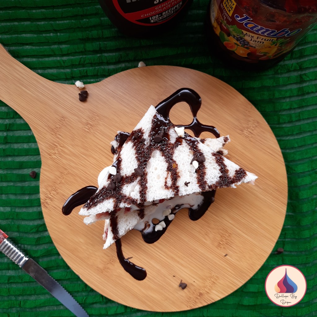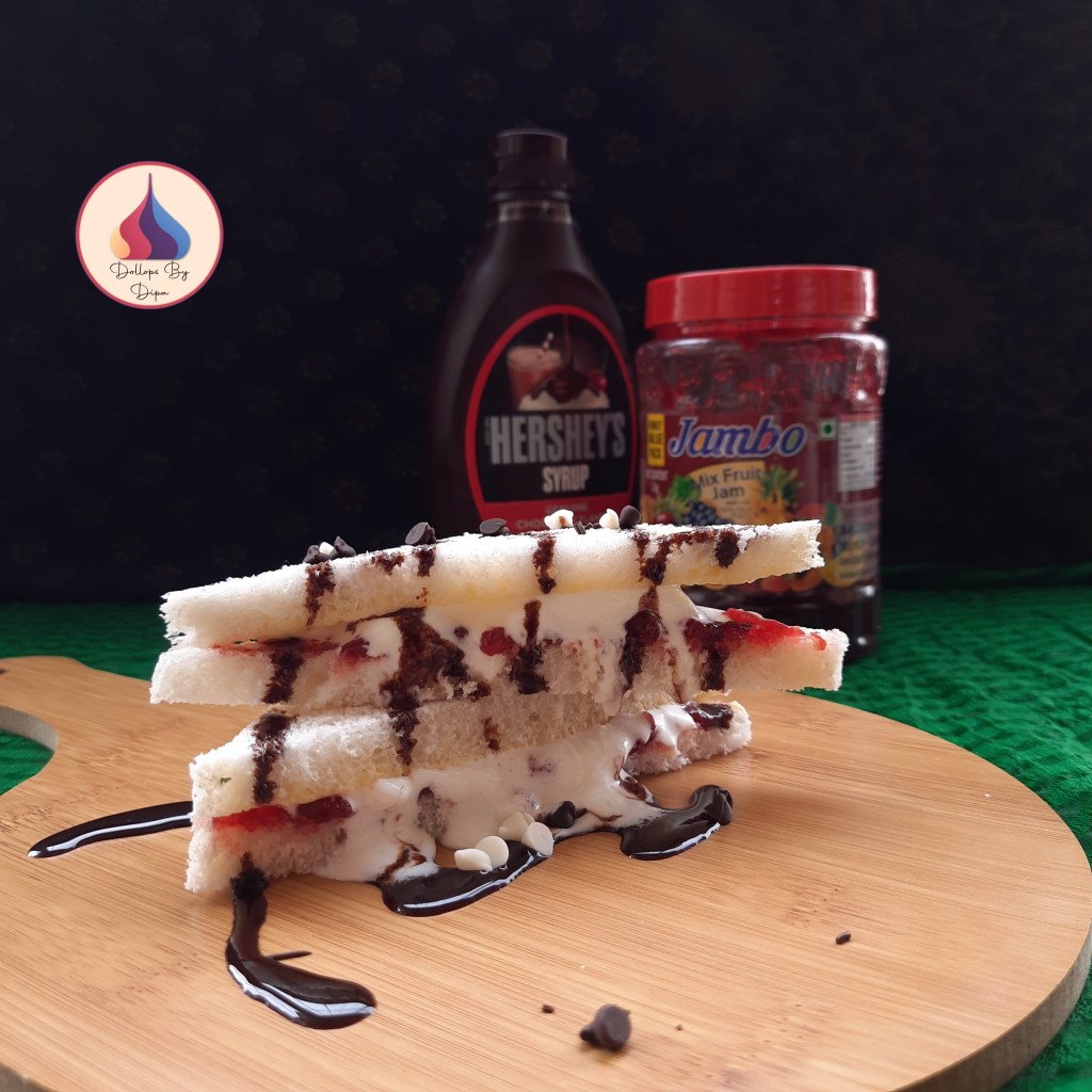 Ice cream sandwich is famous street food of Ahmedabad, Gujarat. Ahmedabad’s famous night food street is Manek Chawk, famous for various food items. Ice cream Sandwich is one of them. Gujaratis are famous world wide for their love for food. Here, Ice cream is not for only summer, it is consumed the whole year. Ice cream sandwich is prepared with ice cream, jam, cheese, chocolate etc. I have prepared without cheese