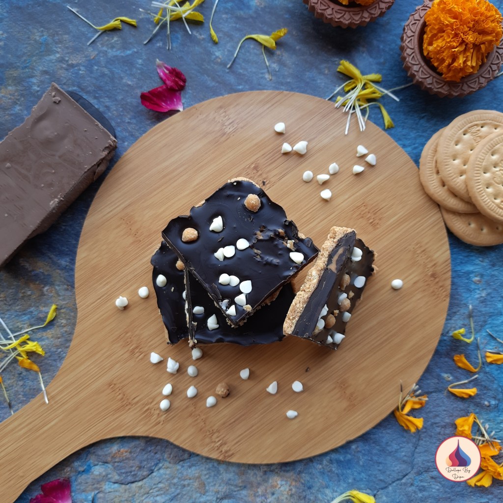 - Pour this on oats biscuit layer. Sprinkle white chocolate chips and butterscotch balls and let it set in refrigerator.