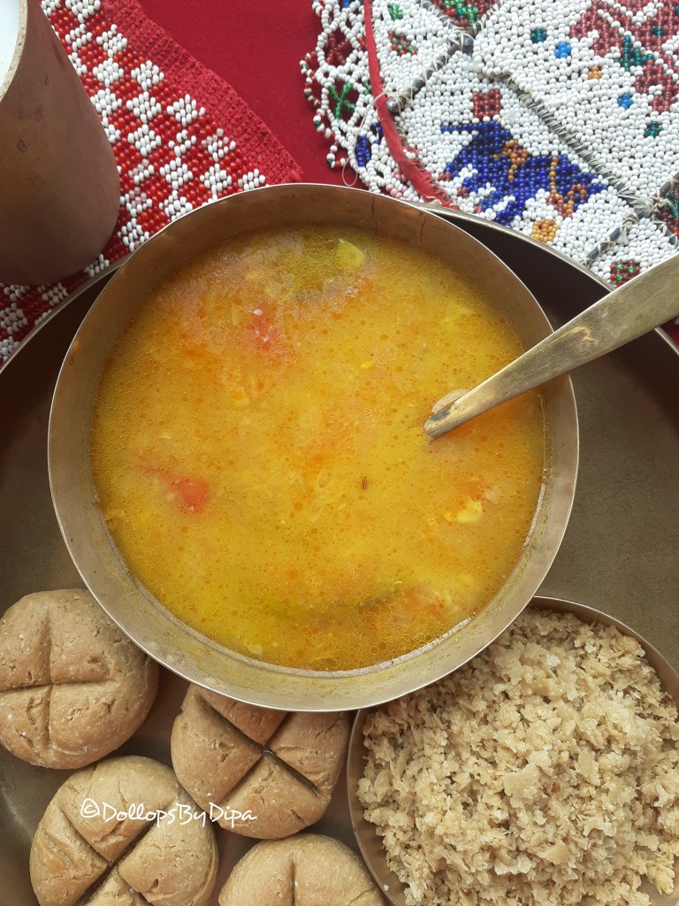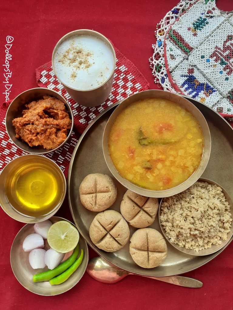 Dal Bati is a common delicacy from Rajasthani / Marwadi cuisine but popular in Gujarat, Maharastra, Uttar Pradesh, Madhya Pradesh as well. This traditional Rajasthani delicacy is a combination of Bati – a wheat flour baked balls and Dal – a mix dal preparation with spices and served with Churma (wheat flour dessert) and condiments like garlic chutney, pickle, ghee , salad, papad, buttermilk etc. It can be served as a lunch or dinner.