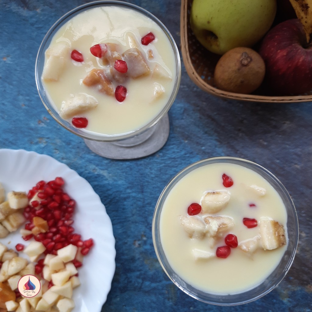 Don’t be confused by the name. It’s not a salad. This is popular dessert prepared with various fruits and custard milk. Though there is fruit and custard in this , it is different from a fruit custard in consistency . This dessert has a sipable consistency. Chilled custard milk along with fruits makes a perfect summer dessert. In Gujarati households it is consumed as a meal along with puri, sabzi etc.