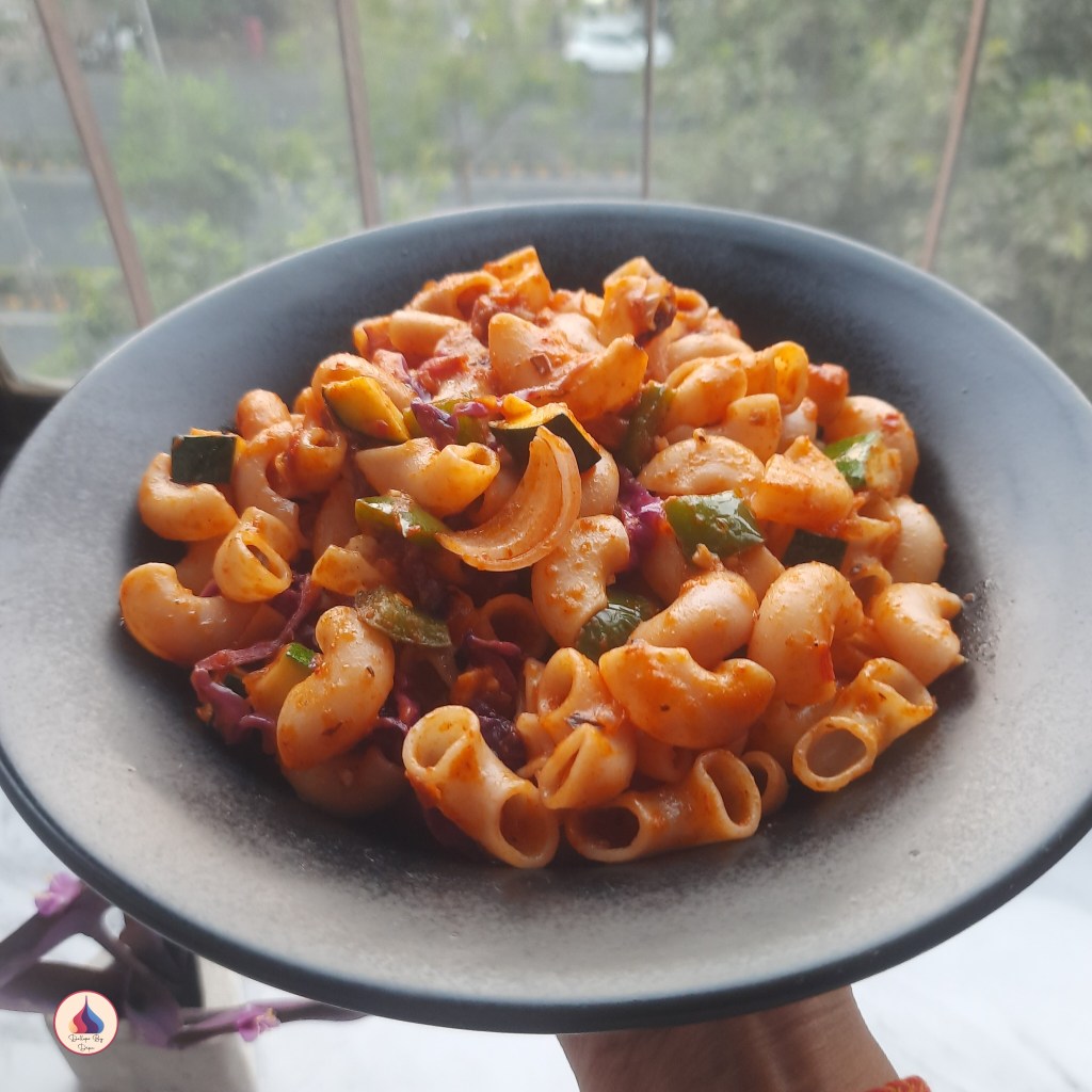 Macaroni is a pasta shaped like narrow tubes, made with durum wheat. Macaroni is commonly cut in short length and usually curved and they are referred to as ‘ elbow macaroni’ . The most popular pasta dish using macaroni is ” mac n cheese”. I have prepared Spicy Masala Macaroni. This Indian style pasta is prepared with lots of spices and veggies.
