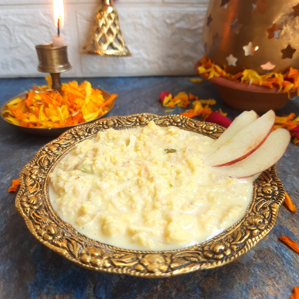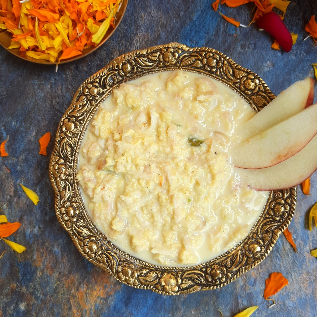 - Once it cools down, peel, remove the seeds, and grate the apple. Add the grated apple to the rabdi and keep it in the refrigerator.