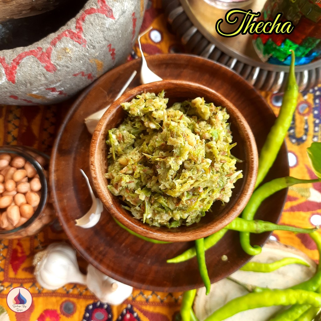Thecha is a spicy condiment prepared in the state of Maharashtra, India. It has many variants, but the primary ingredients are chili peppers (green or red), peanuts, and garlic, often tempered in oil (generally peanut oil) and a multitude of spices such as cumin seeds, coriander seeds, hing, cloves, coriander leaves, and grated coconut seasoning.