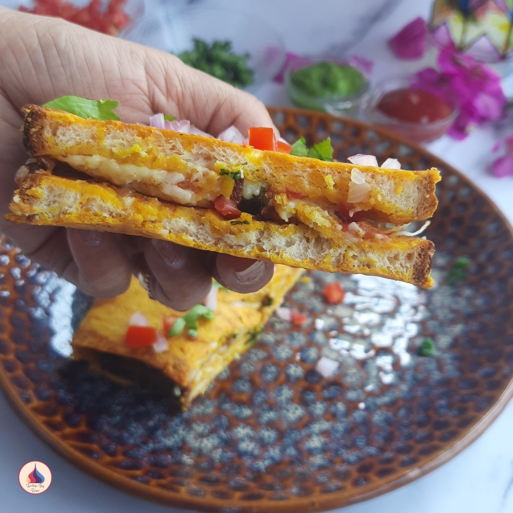 - Sprinkle sandwich masala and add butter, flip and cook.