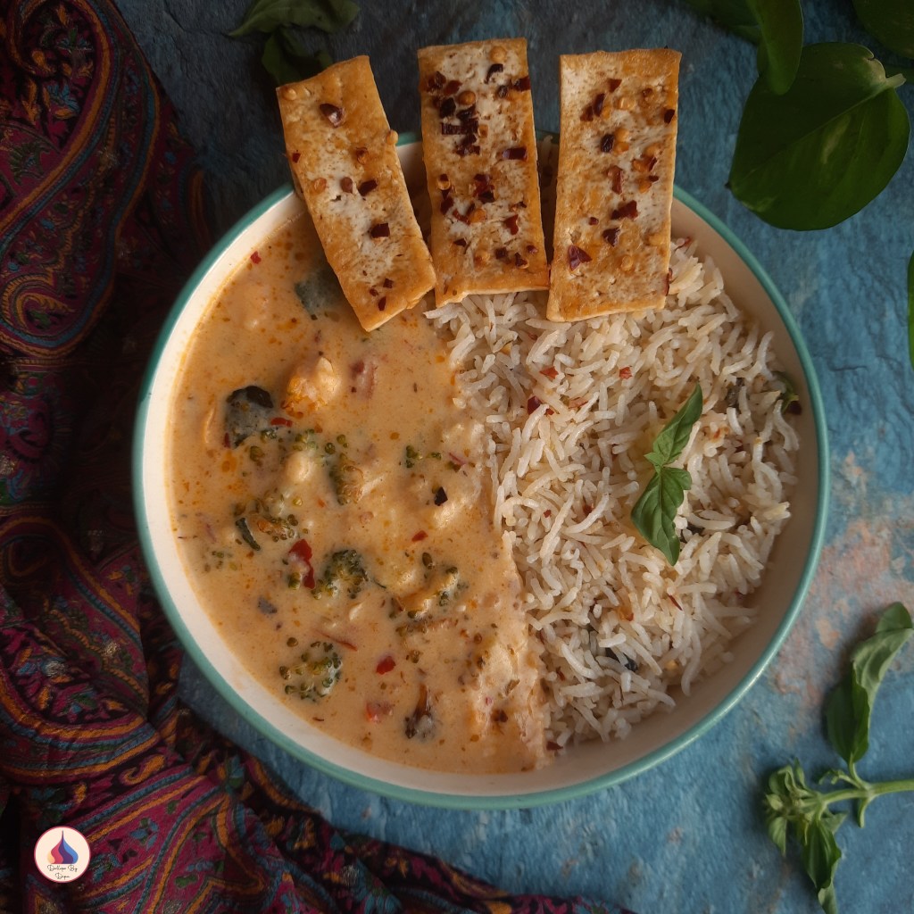 In this recipe, I’ve prepared herb-infused rice with a creamy and spicy vegetable curry and grilled tofu.