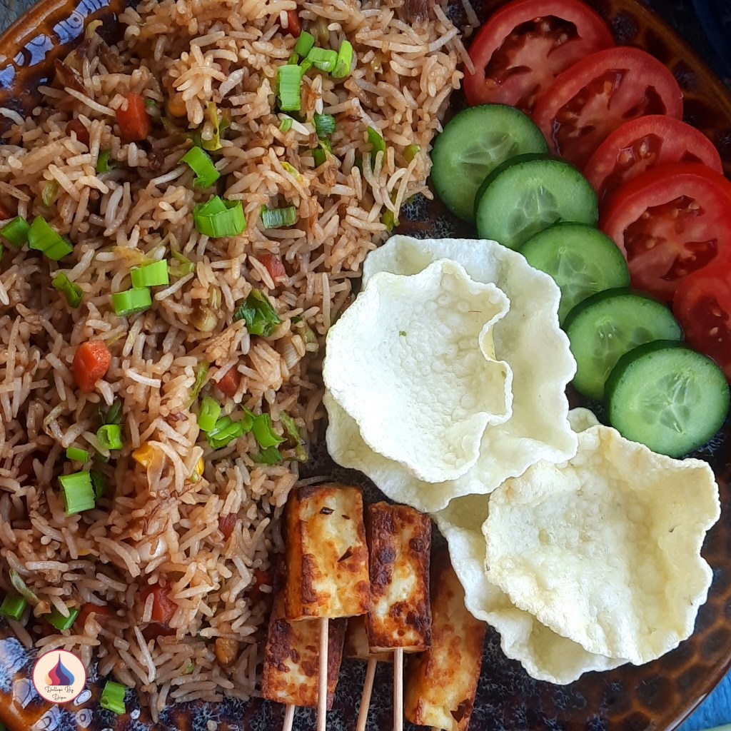 Nasi Goreng is the popular Indonesian fried rice which traditionally served with fried egg along with salad, meat satay, prawn chips etc. The word ‘Nasi’ means Rice and ‘Goreng’ means fried in Indonesian and Malaysian language. So when we combine Nasi Goreng, it literally means ‘Fried Rice’. Here I have prepared vegetarian version. I have served Tofu Satay Instead of meat satay and rice chips instead of prawn chips. I inspired and recreate this recipe from DyahWulan Bae. @iwulan_1404. My hearty thanks to her for vegetarian version.