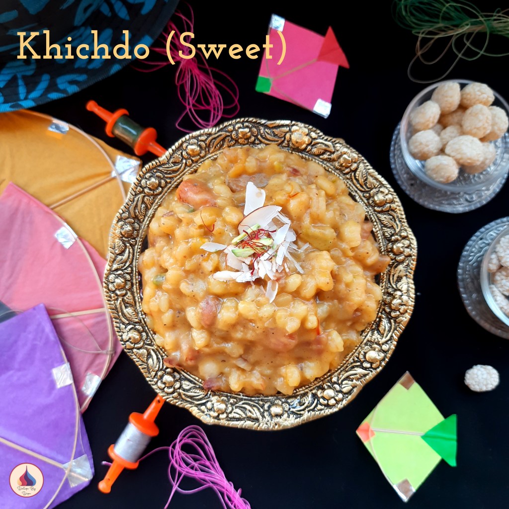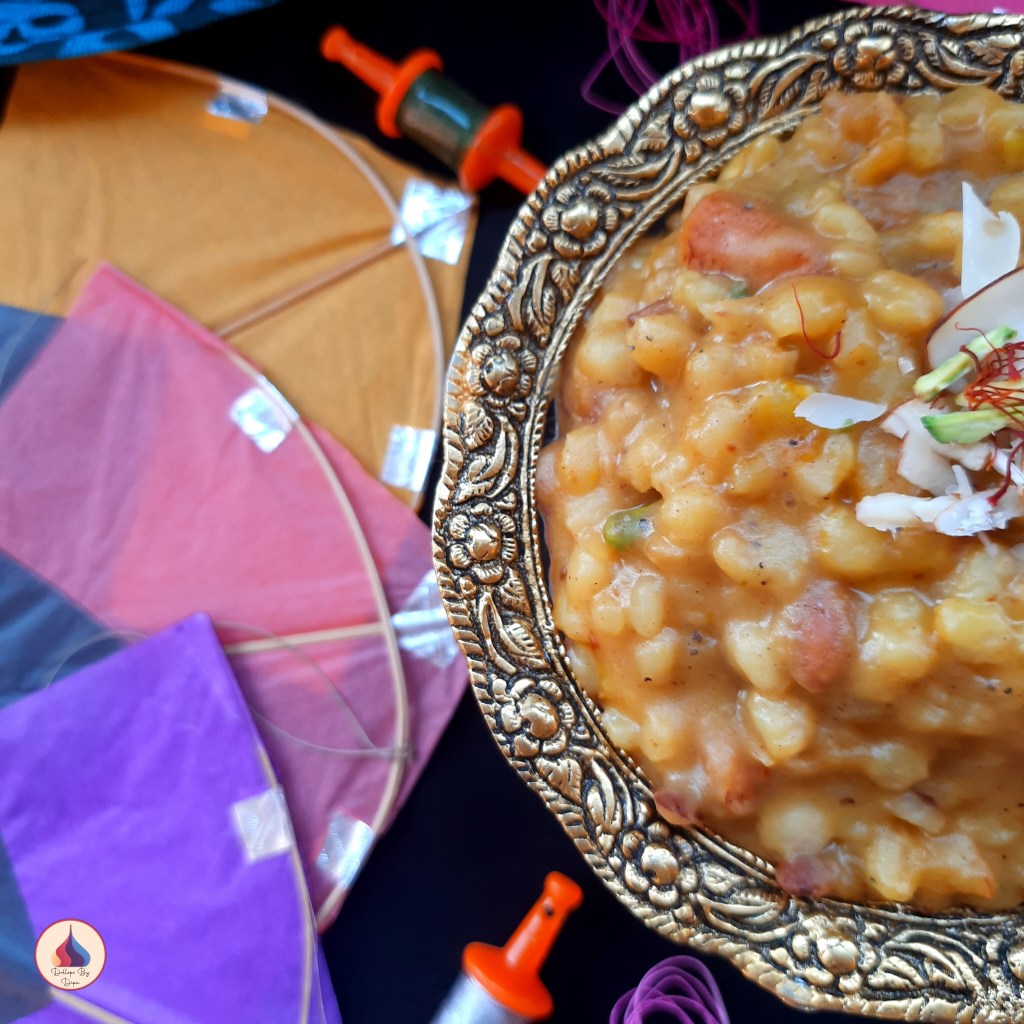 Mitho Khichdo is prepared on Makar Sankranti in Gujarat, in households and also in temples as Prasad. ‘Mitho’ means sweet in Gujarati. The dish is prepared with husked wheat, peanuts, split pigeon peas (Toor dal) and lots of dry fruits. This creamy and filling delicacy tastes heavenly.