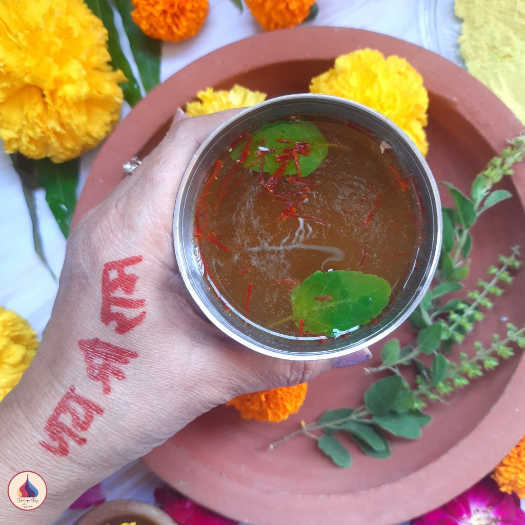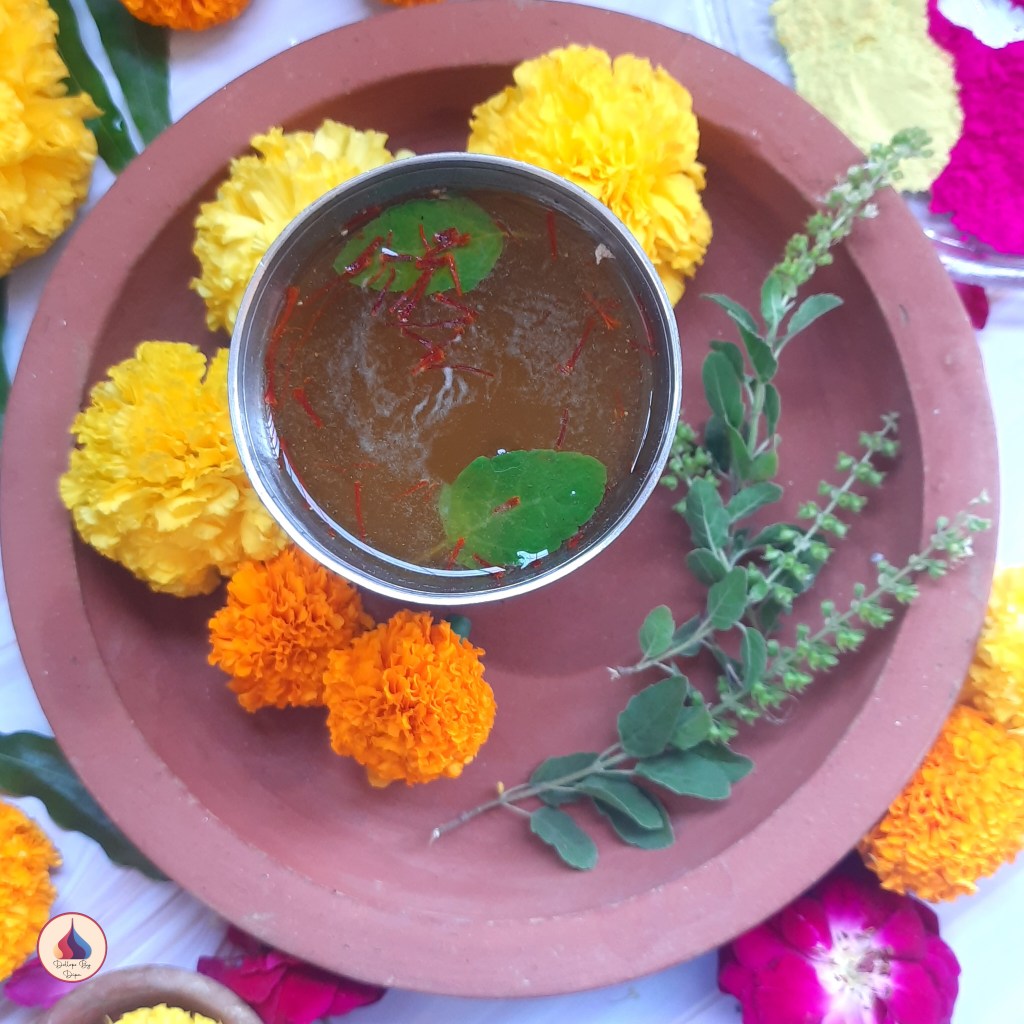5. At the time of serving, add tulsi patra to each glass and serve.