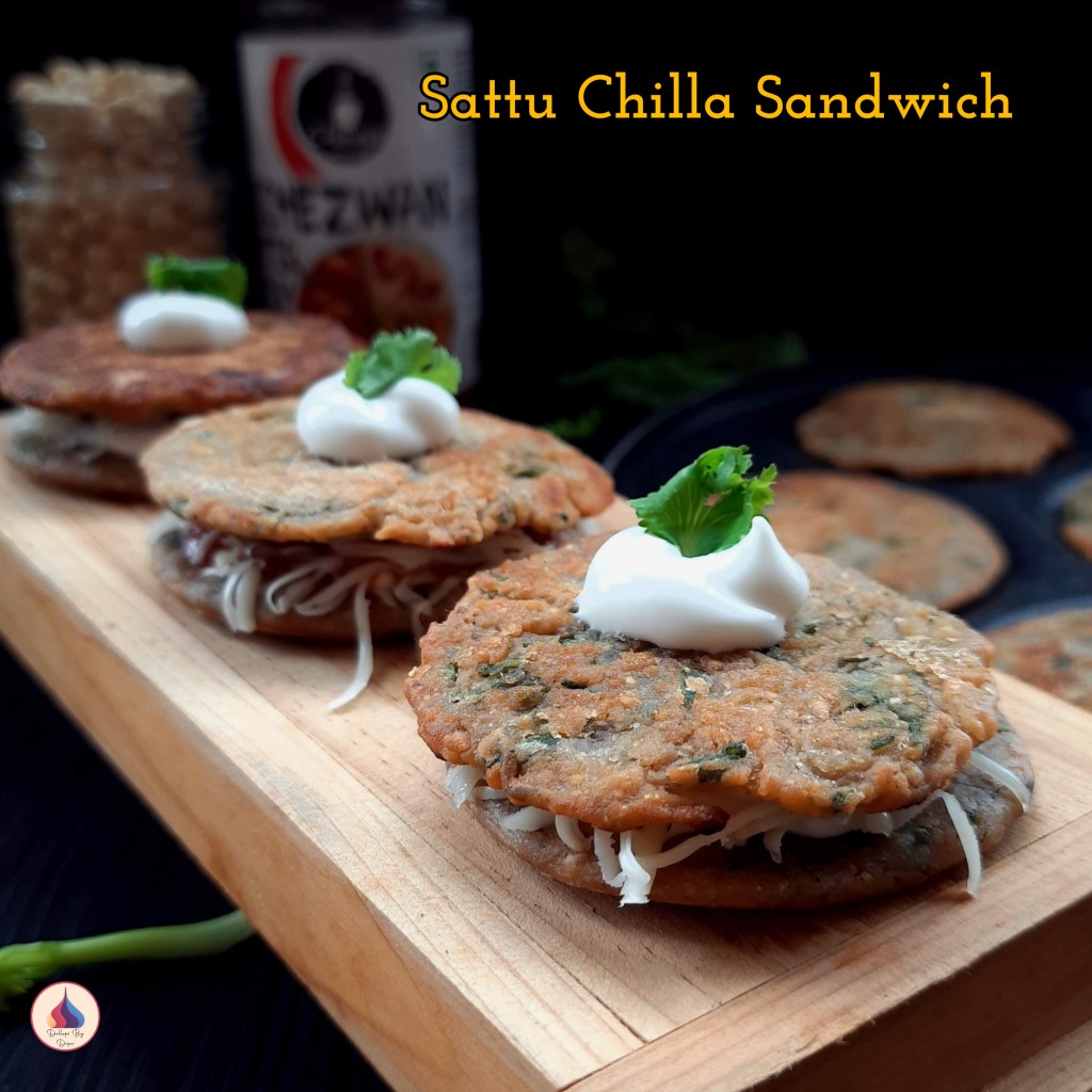 Many dishes can be made using sattu, such as paratha, puri, kachori, sherbet, laddoo, etc. Today, I made chilla (savory pancakes) using sattu, coriander, and spinach, and to make it more delicious, I added mayonnaise, ketchup, Schezwan sauce, cheese, etc., turning it into a sandwich. This makes a healthy and tasty snack for kids.