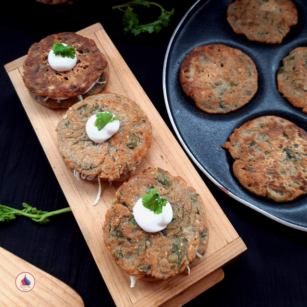 - Heat a mini uttapam pan or non-stick pan, grease it lightly. Pour a spoonful of batter and spread it. Drizzle some oil around it, cover and cook on medium heat.