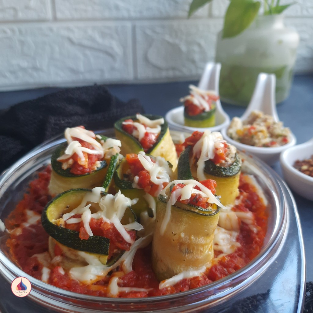 In this recipe, I’ve stuffed the zucchini with a flavorful paneer and bell pepper filling, then served the rolls with a spicy and tangy arrabbiata sauce.