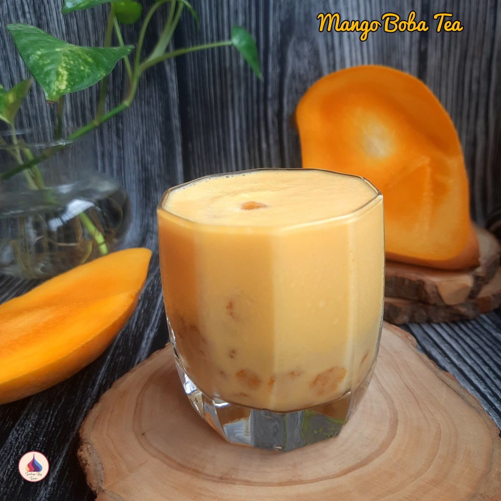Add 1/2 cup of boba pearls to a glass, top with ice, and pour in the mango milk.