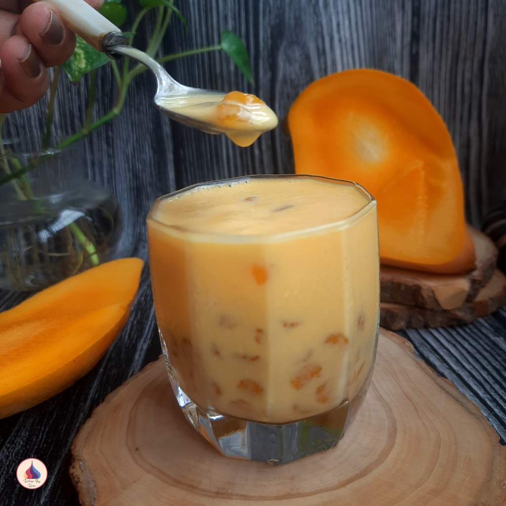 To make the mango milk, blend the mango puree, sugar, and milk together.