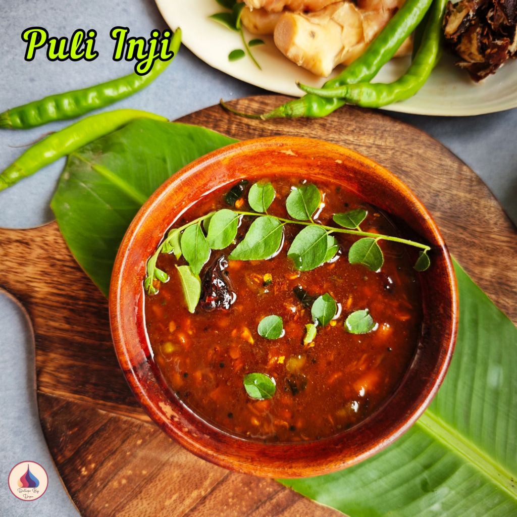 Puli Inji, also known as Inji Puli, is a traditional Kerala-style sweet, sour, and spicy chutney made mainly with ginger (inji) and tamarind (puli). It is an indispensable part of the grand Onam Sadhya feast. This chutney beautifully balances flavors — the tanginess of tamarind, the heat of green chilies and ginger, the sweetness of jaggery, and the earthy aroma of roasted spices. It acts as a digestive and enhances the overall taste of the feast when served with rice and other curries. Apart from Onam, it is also prepared for special occasions and festivals across Kerala.