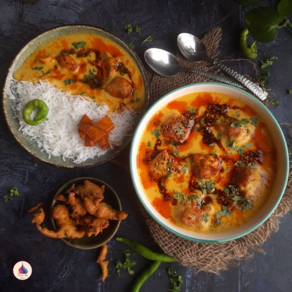 Kadhi Pakoda, also called Pakoda Kadhi, is a traditional North Indian dish, especially popular in Punjabi households. This comforting curry is prepared with a tangy curd and gram flour (besan) base, slow-cooked with aromatic spices until it turns creamy and flavorful. Deep-fried onion or mixed vegetable pakodas are then added, making the kadhi wholesome and satisfying. Its golden yellow hue, the balance of tangy and spicy notes, and the soft pakodas soaking in the kadhi make it a soul-warming dish often paired with steamed rice or jeera rice. Apart from being delicious, kadhi is also light on the stomach, aids digestion due to yogurt, and provides plant-based protein from gram flour.