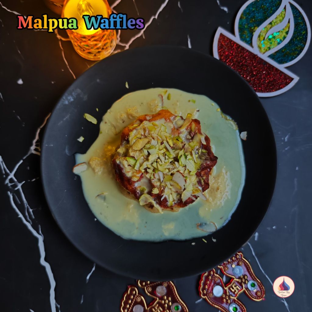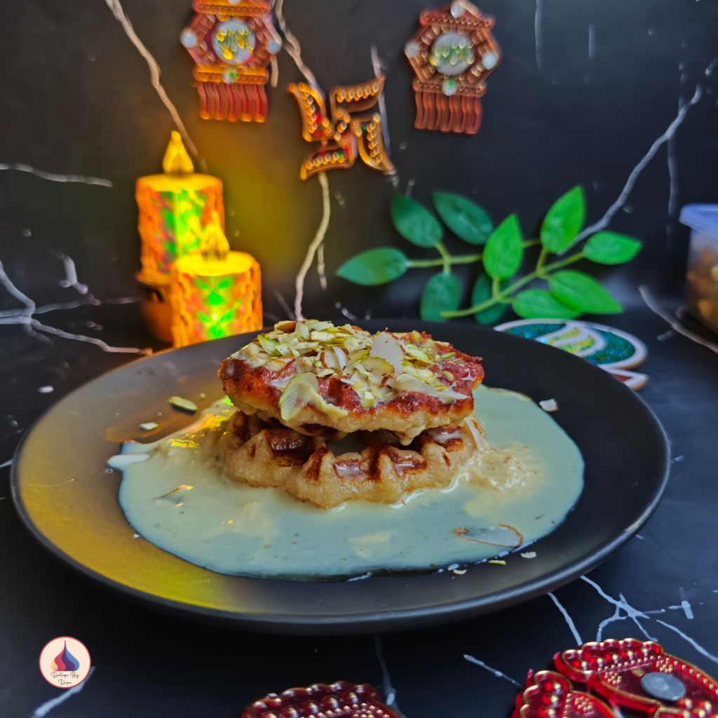 Malpua Waffles are a creative fusion twist on the traditional Indian sweet Malpua. These waffles are made with wholesome wheat flour, semolina, curd, and milk powder — infused with the rich aroma of cardamom. Instead of deep frying, the batter is cooked in a waffle maker to get a crisp yet soft texture. Served with saffron sugar syrup and creamy rabdi, this dessert brings together Indian flavors and modern presentation beautifully. Perfect for festive treats or indulgent brunches!