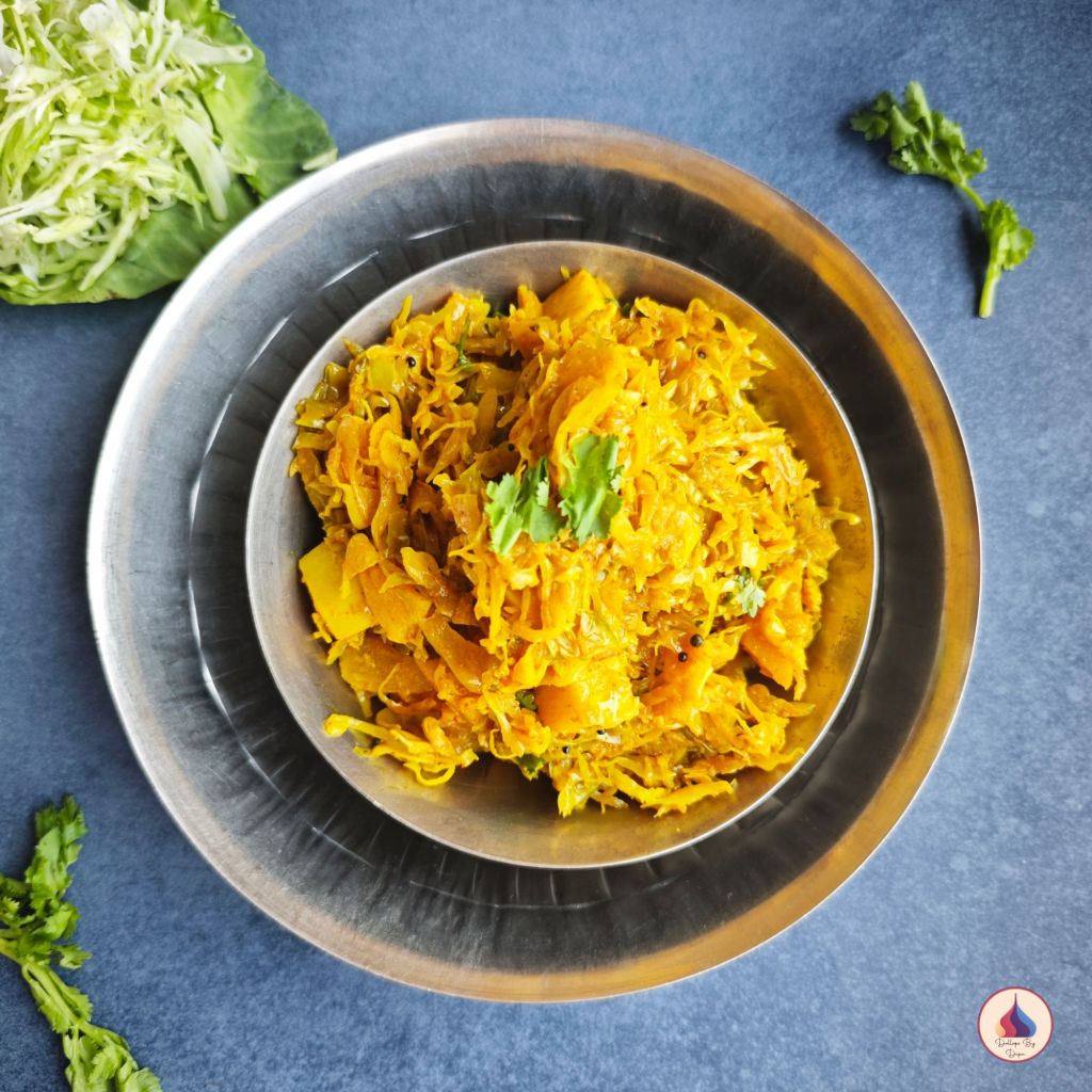 This home-style cabbage sabzi is a simple, comforting everyday dish made with basic pantry spices. Light, flavourful and quick to prepare, it’s perfect for daily meals and pairs wonderfully with roti, phulka or dal-rice. Cabbage, the star ingredient of this sabzi, is a highly nutritious vegetable—rich in vitamin C, fiber, antioxidants and beneficial plant compounds that support digestion, boost immunity and promote overall well-being. When cooked with a touch of potato and gentle spices, it turns into a wholesome, homely sabzi that suits both busy weekdays and traditional Indian meals.