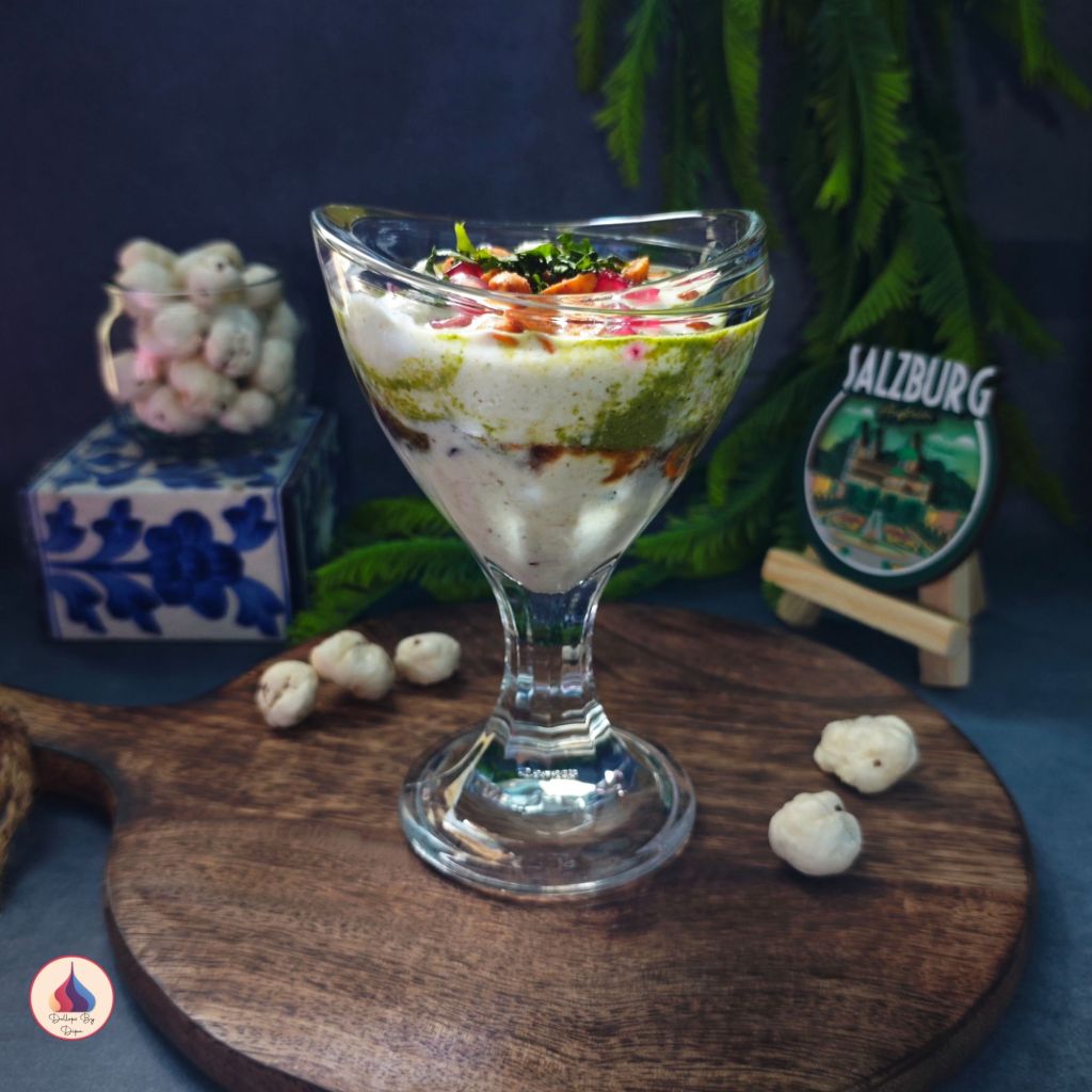 A quick, no-fry twist on the classic dahi bhalla using makhana (fox nuts) instead of lentil fritters. These soft, creamy bites soak up spiced yogurt and are topped with tangy chutneys, crunchy nuts, and juicy pomegranate—making it a perfect healthy chaat for snacking or festive serving. Served in mini glasses, they also make an elegant party appetizer!